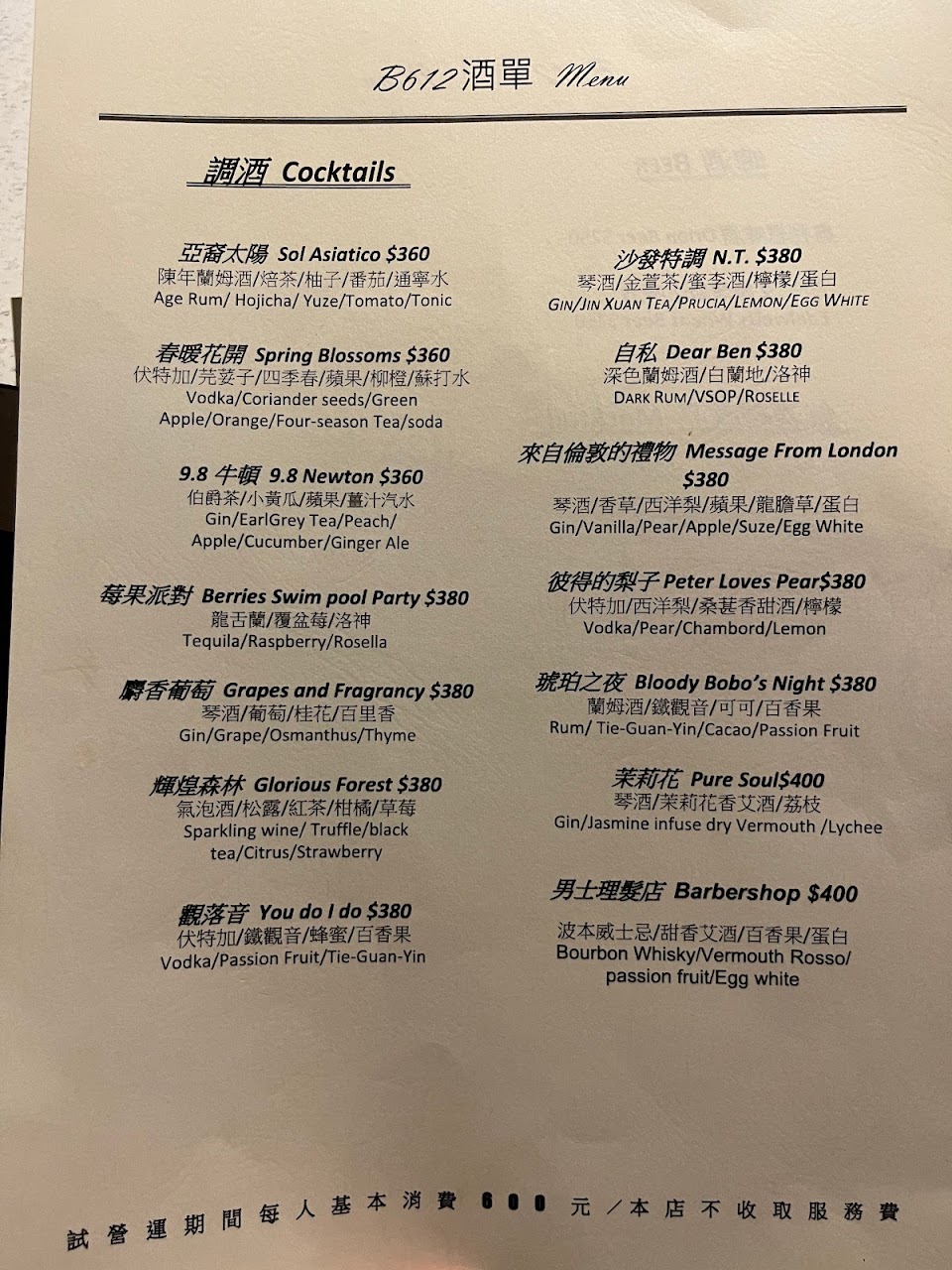 ?觀落音 以Vodka為基底的茶酒,茶味略顯不足一些, 搭上百香果及蜂蜜調和,茶味有些被蓋過, 但整杯喝起來是清爽好喝的,酒感不重, 當開胃酒喝很可以。 – 可能對B612的期待太高,相對有些失望, 但店員服務真心覺得棒,超級貼心且親切, 離開前,活動領取的熱紅酒超級好喝, 冬天喝熱紅酒,整個身體都暖起來了! 可惜太小杯了啦!一口就喝光了? B612的調酒及環境很不錯, 但餐點希望能再加強些就更好了。