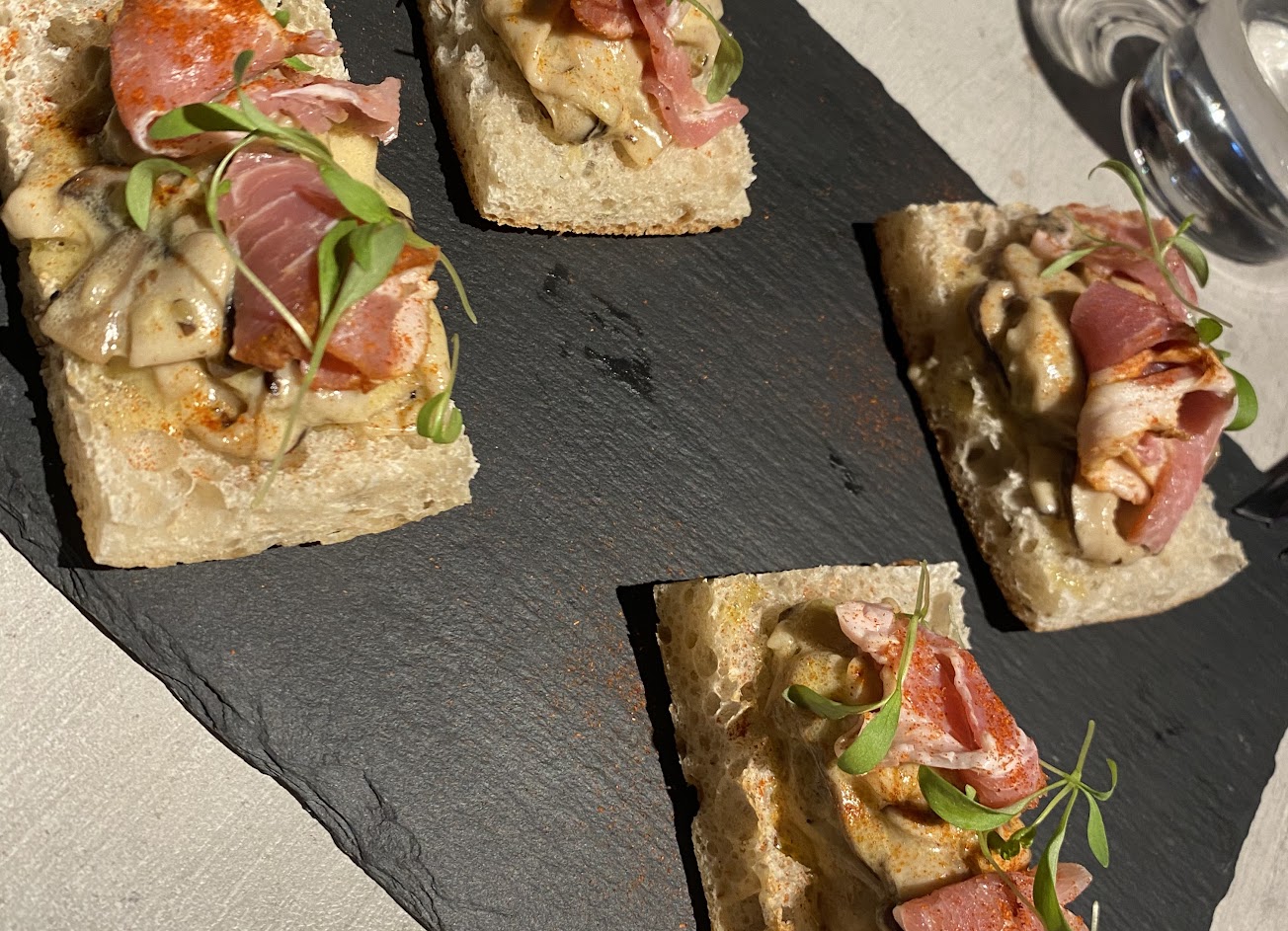 – 等了一小時才拿到第一份餐點,我們五人用餐,每人點一杯無酒精飲料、松露薯條、四人份滷味拼盤、烤雞、義大利麵跟燉飯各一,再加上一份四片麵包配生火腿的前菜,平均$1000/人,以東區餐酒館的價位來說是個正常價位