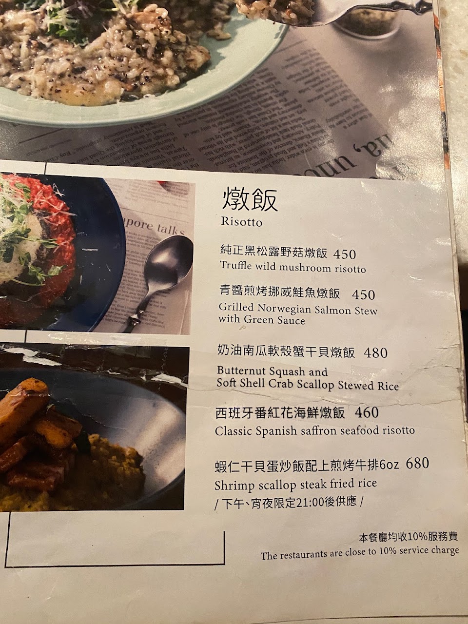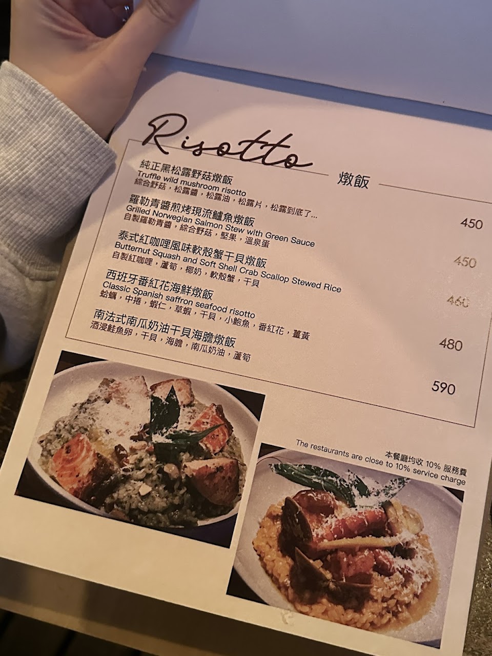 中午進入餐廳,感覺昏暗的燈光及氣氛很適合夜晚下班和三五好友一起來放鬆的餐館,裡面的裝飾有些古典,燉飯松露味道濃郁,鮮奶茶上有棉花糖點綴,甜度適中好喝。