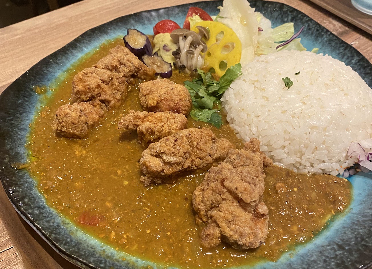 與一般認知濃稠勾芡咖哩不同,也與一般覺得日本咖哩就放蘋果的刻板印象不一樣,屬於高湯系,配上不同的香料,店家特別在菜單上叮囑不要全部拌在一起吃,不同配菜伴著胚芽米香,接著感受鼻息間不同香料的沁鼻,舒心,整盤吃下來非常清爽,不會有過濃過重的負擔感。唐揚雞非常Q彈帶勁、香甜!相較之下豬肉薄片就沒有那麼滿足的肉感,唐揚中卷的表現也很不錯,美中不足是仍偏油~