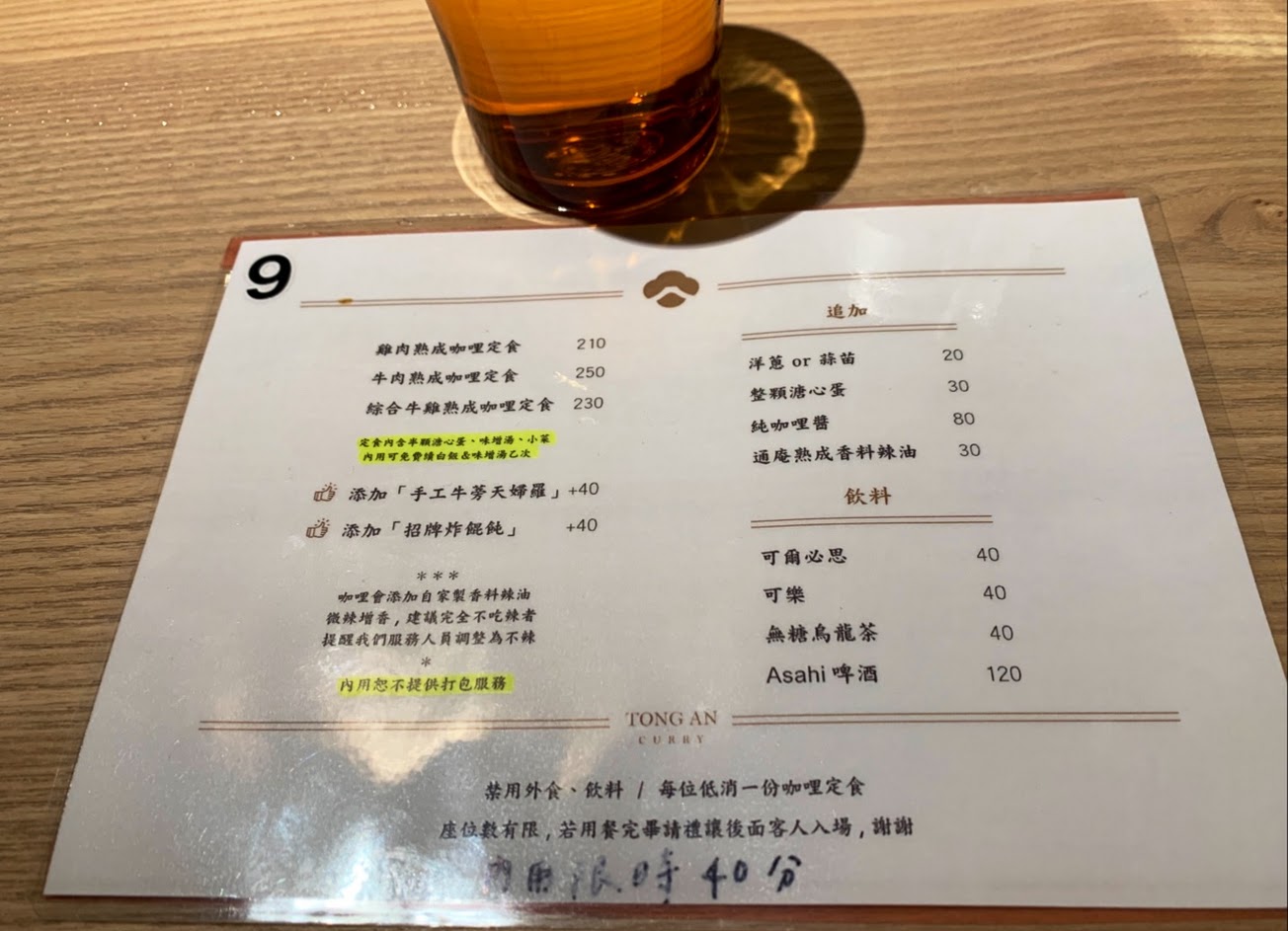 通庵熟成咖喱的內用及外帶價格是不一樣的!因為內用定食皆包含溏心蛋、味噌湯、白飯、小菜,可免費續白飯和湯一次,外帶是不包含湯跟小菜的,所以內用的價格略顯高一點。