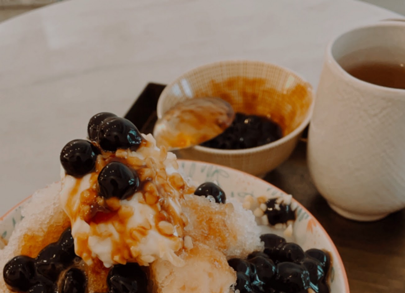 鐵觀音紅鐵雙拼刨冰淋上店家自製的鐵觀音醬和紅茶拿鐵醬