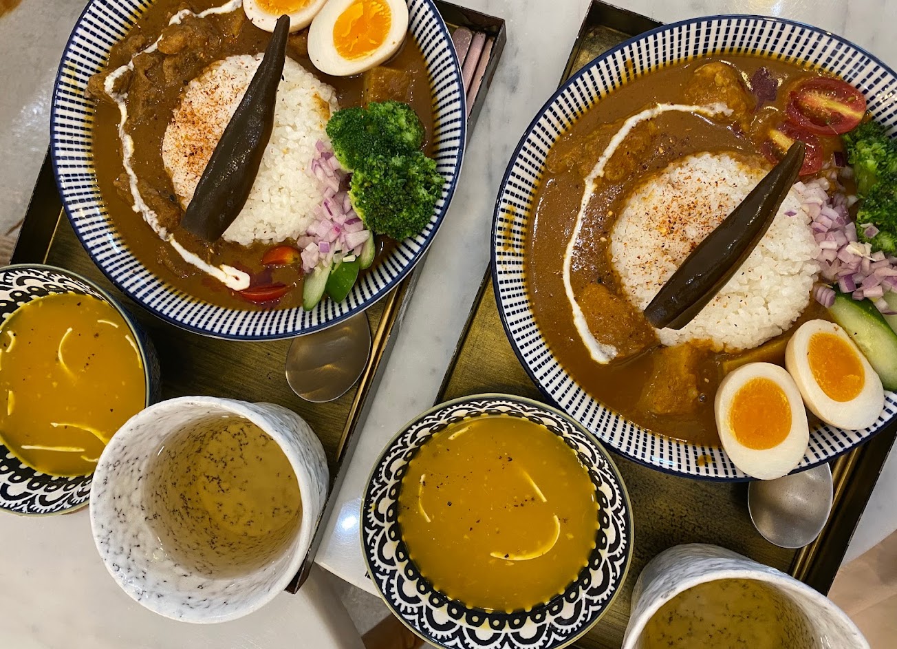 手工特製的香料咖哩,放上溏心蛋、燉馬鈴薯塊、花椰菜、番茄、紫洋蔥碎粒