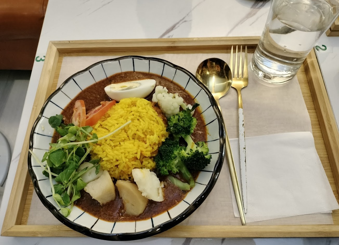 本來很期待吃熱的咖哩 但只有馬鈴薯是熱的 其他蔬菜就… 飯只有微溫… 咖哩味道蠻夠的喔 辣度控制的很好 內用相對價格來說就…稍貴 建議各位外帶,旁邊一堆地方可以坐下來吃 但服務生需要加強一下 要看一下Line點餐 上面就會寫桌號與餐點了… 餐點:5 服務:2 氣氛:5