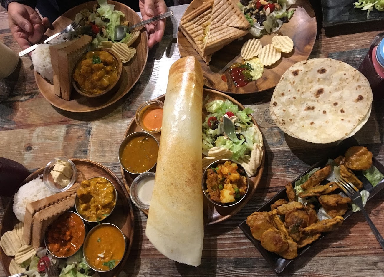 口味有在地化的印度風味蔬食餐廳,雖然沒有葷食,可是吃完不會有那種沒吃到肉沒吃飽的感覺。雙人套餐裡頭種類非常多,除了主餐還包含開胃菜、印度薄餅、甩餅、飲料甜點,重點是每一份量都很多!主餐可以直接選擇三種咖哩的印度塔麗,能一次品嚐到扁豆、花椰菜馬鈴薯和蓮子豆口味的咖哩,附的米飯和麵包沾著吃一下就吃的精光。另一道香料堅果飯雖然口味更清淡一些,仍是有優格醬料可以搭配著飯一起吃,配上堅果也是飽足感十足。薄餅很大一片,剛上桌熱熱的時候最好吃!飲料推薦薑黃牛奶,淡淡薑黃味不會太刺激。另外香料鮮奶茶反而是整餐下來口味最厚重的了,喜歡重香料的可以嘗試看看。