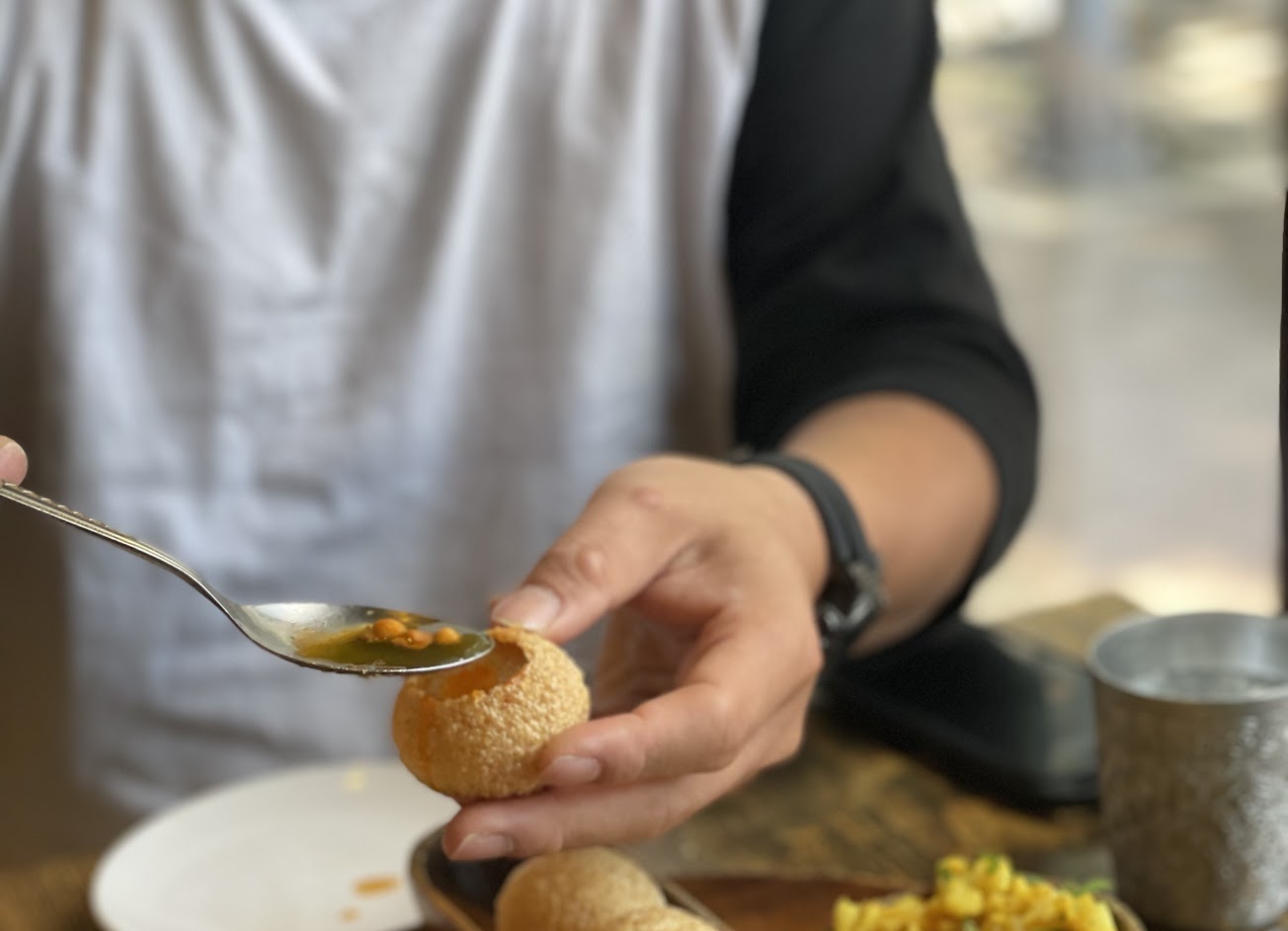 意外的邂逅,有點驚喜!2022的第一個上班日,適逢農曆臘月初一,難得可以自主持齋,無意間來到這家陌生的印度蔬食餐廳,在一場持續30秒以上的地震之後,被它的第一道菜-Pani Puri 芒果酸子酥球驚喜了一下,這道印度街頭小吃,雞蛋糕大小的薄片脆球,用湯匙的尾端敲破(在印度多半是用手掐破),填入伴有香菜調味的馬鈴薯,再淋入芒果和薄荷兩種調味汁(在印度也經常是直接用脆球粘入),一口送進嘴裡,脆皮被摧破的同時,一股既清爽又濃郁的味道在嘴裡炸開,感覺非常刷嘴,他家的咖哩角 Samosa是現炸的,唯一建議是可以做小一點,否則一個下肚,太佔位子了,三種咖哩的塔麗,配有Roti餅,脆薄片和薑黃飯,份量和味道不錯,辣豆腐這是番茄底的辣味燒豆腐,味道夠,但沒什麼特色,是一家有特色的印度蔬食餐廳!