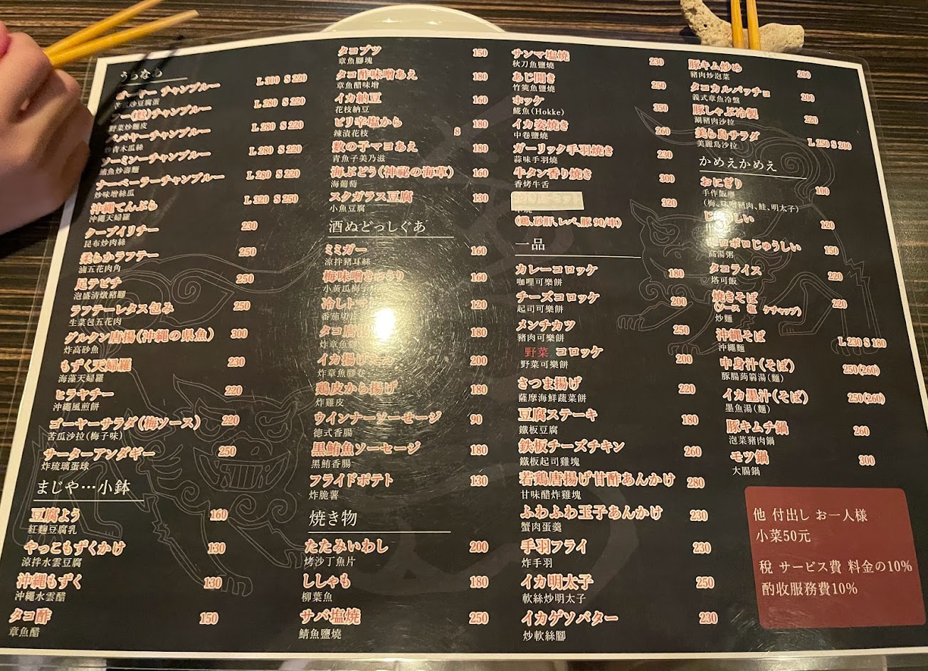 氣氛還不錯的店,從牆壁到天花版的風獅爺、Orion 啤酒到好吃的沖繩料理,想像一下,真的彷彿到了沖繩路邊的居酒屋?