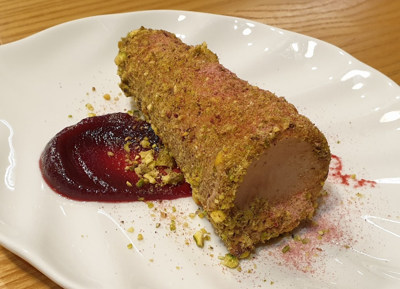 魚餅外層包覆著一層脆殼,內裡青魽的魚肉風味和纖維感強烈,鯷魚蛋黃醬除了鮮味外,尾韻帶著一絲辣味,周遭的蔬菜除了口感變化,也給這道菜提供了清爽感,整體味覺蠻豐富的