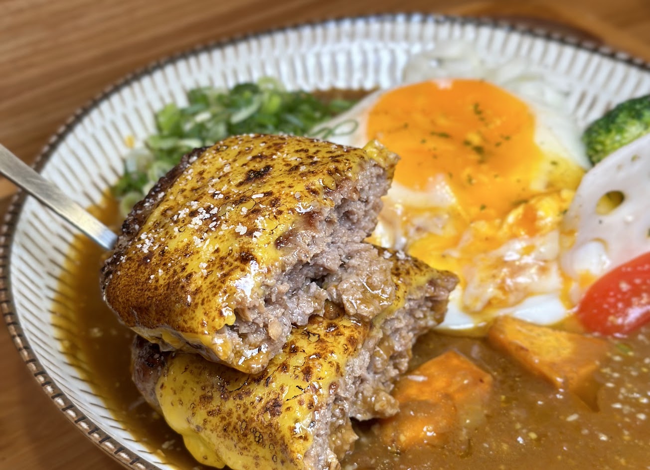 厚實的牛肉漢堡排肉汁飽滿,口感鮮嫩,牛肉肉香明顯,搭配炙燒起司片超加分❤️日式咖哩溫和濃郁,味道偏甜帶點辛香,有別於一般咖哩醬,裏面居然還吃得到烤地瓜!