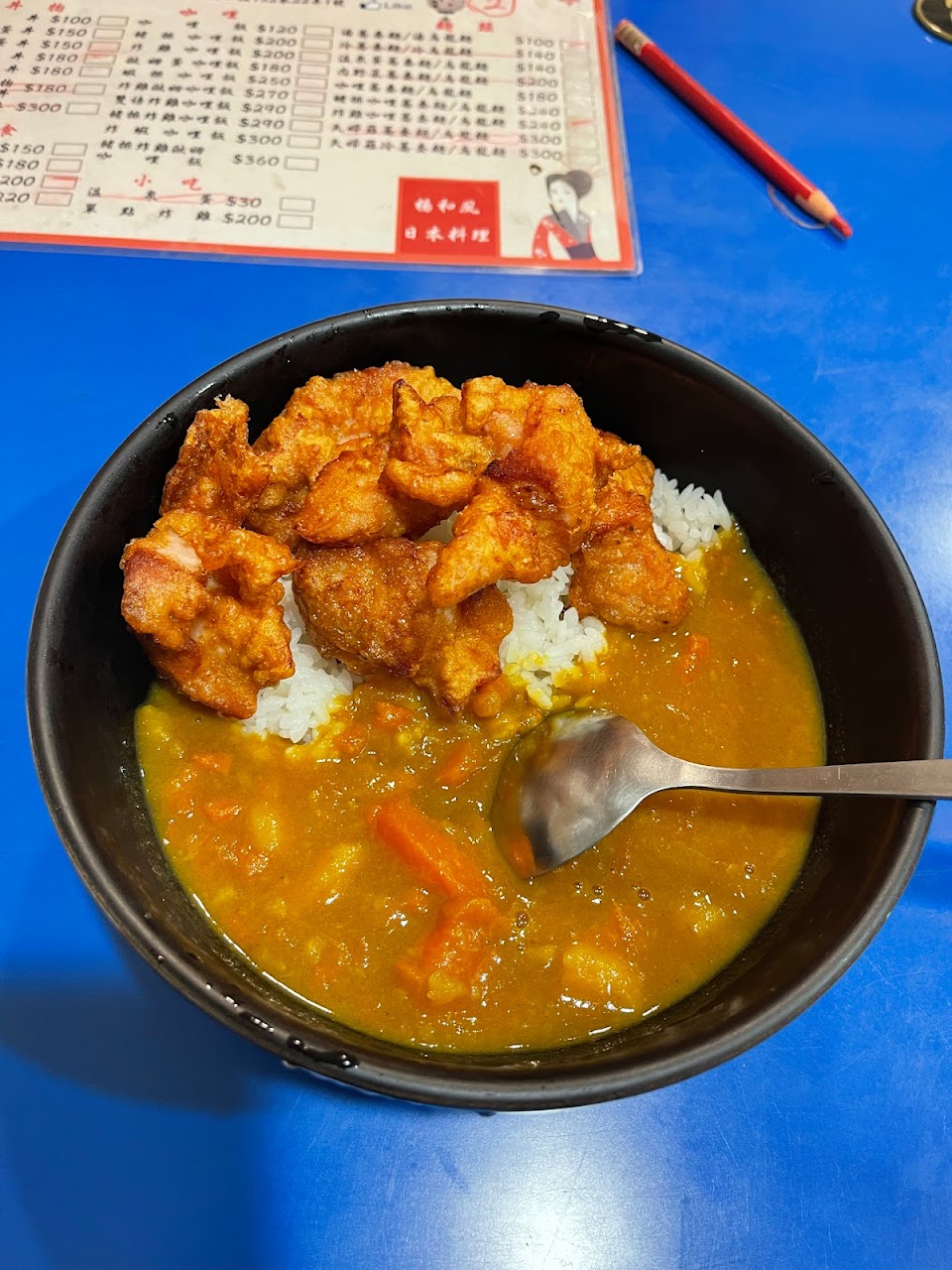 點了炸雞咖哩飯,老闆娘說咖哩是他親手做的,不是外面的化學物質;