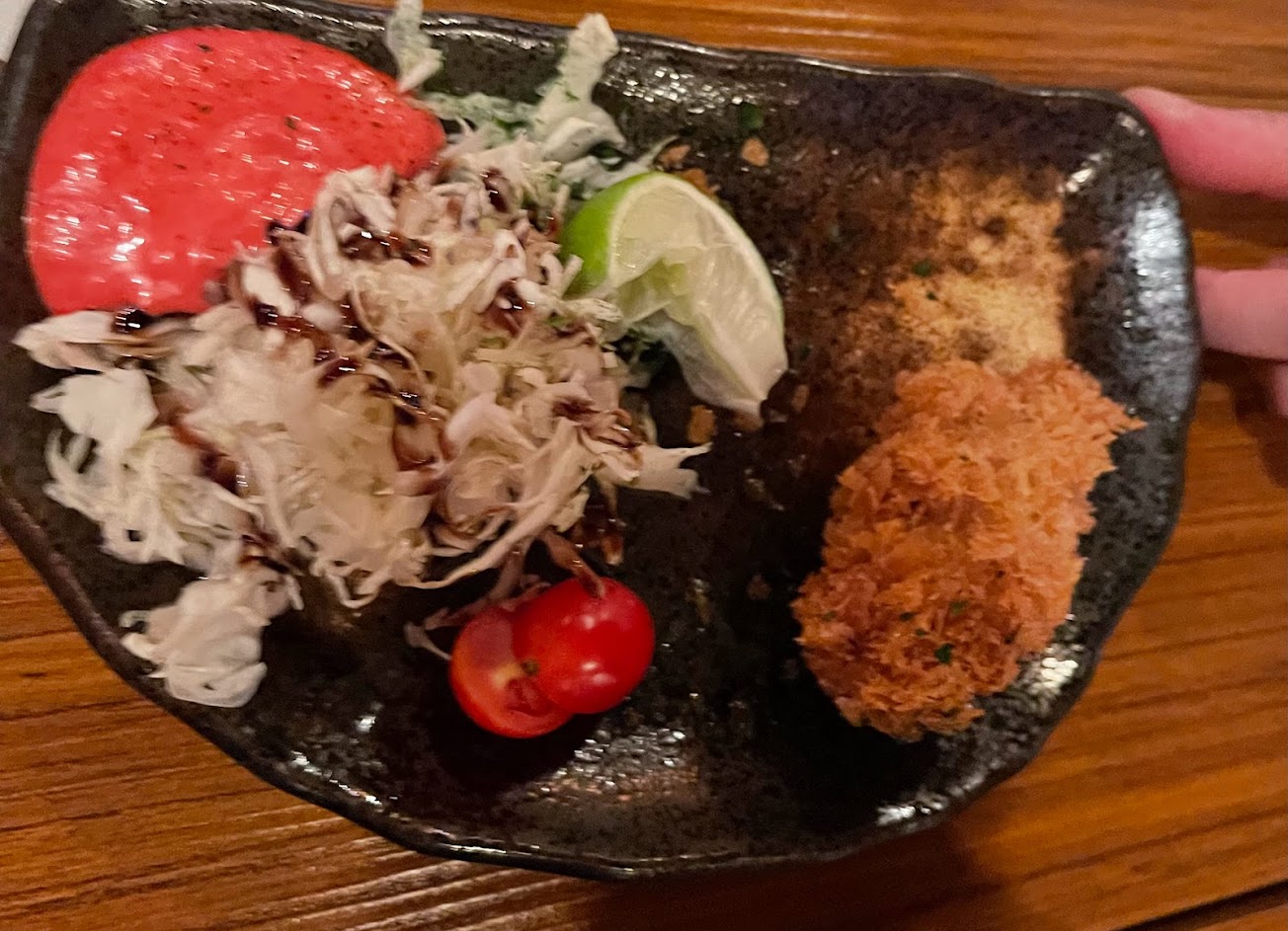 ABV日式居酒屋,日料版的ABV,藏身在台北中山北路,餐點日式化,炒烏龍麵,炸牡蠣,甜丸子,一夜乾,這一夜乾非常的好吃,魚的甜味完全所在魚肉內,每一口都很鮮甜,外皮酥脆,愛吃魚的可以吃一隻,大阪燒,小小的一個,非常別緻,搭配餐酒別有一番風味,香菇蛤蜊湯,一個蔬菜火鍋,湯頭清爽,重口味下的明燈,份量除了湯外都不算多,蠻適合配酒的餐點,如果想吃飽還可以加鍋飯,整體來說,個人覺得算是中規中矩的餐酒館,每道菜都非常順口好下酒,可以輕鬆的跟好友喝酒品美食的好地方。