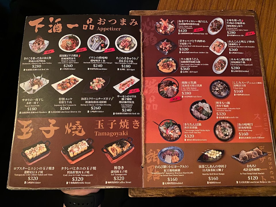 起司明太子玉子燒好吃、鮭魚稻草燒還好,醬油有點太淡、鹽燒雞肉串跟名古屋手羽先份量夠但有點太鹹。啤酒選項很多,有很多在歐洲愛喝但台灣難買到的啤酒;服務的小姐很熱心介紹啤酒,服務態度也很好。