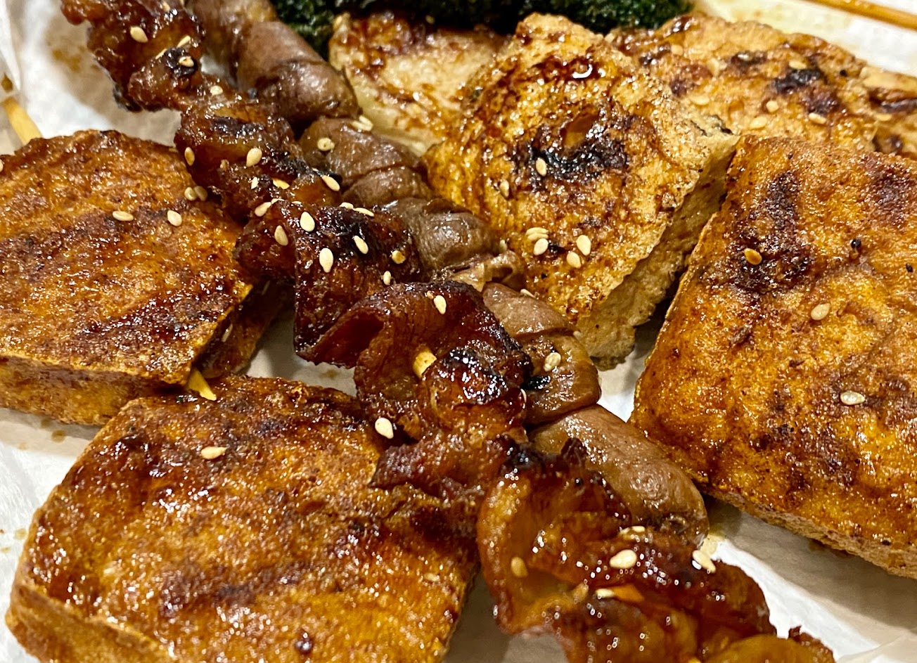 雖然是攤販,老闆注重食材的保冷新鮮及衛生。燒烤前先炸酥仔細翻面反覆塗抹醬汁,外酥脆但食材軟嫰,白芝麻襯出濃淡合宜的醬汁。