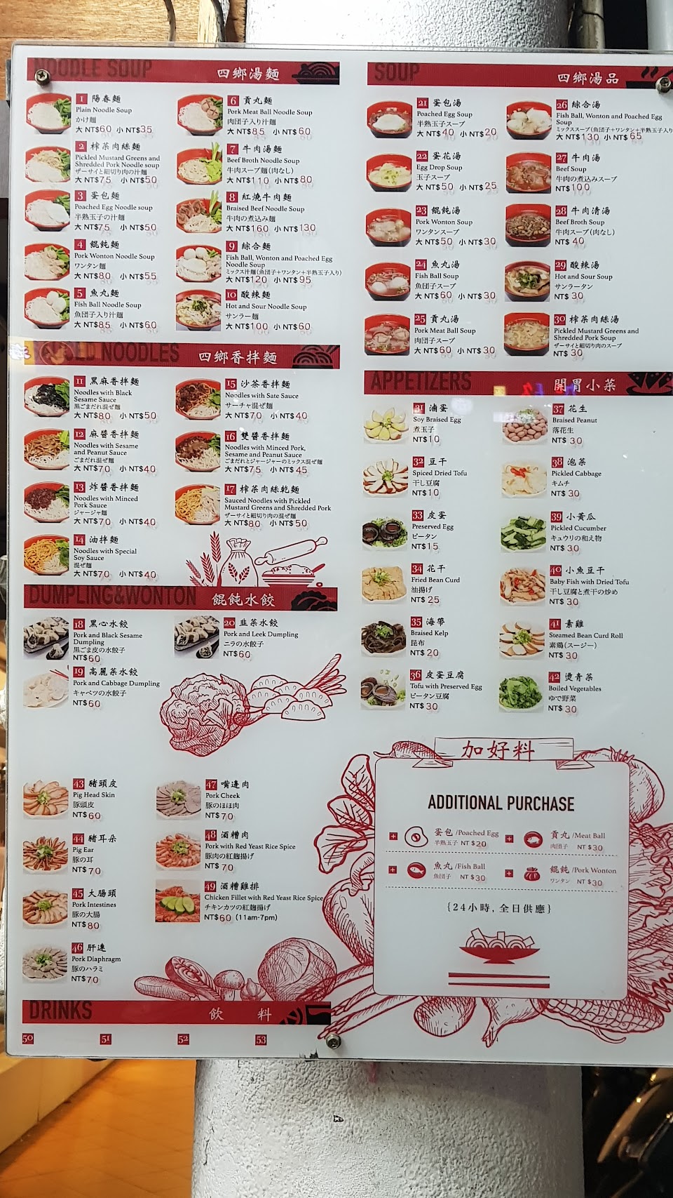 24小時營業,下飛機後的宵夜,老闆娘掌廚時麵的熟度較佳,滷味必須來一盤,小黃瓜也得點