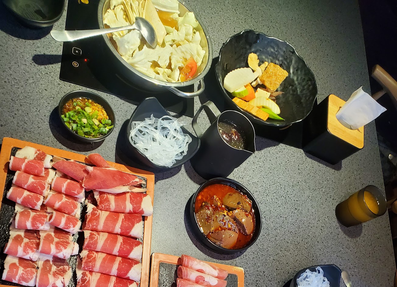 看評價很好來吃吃看,座位很寬敞,桌上大小能擺很多餐盤,湯底是偏清爽型的,今天吃了冬蔭功湯頭,有酸味但味道不夠濃厚,羊肉適合真的愛吃羊肉的人,因為騷味偏重。單點區的小食表現不錯,推煉乳銀絲捲、麻辣鴨血