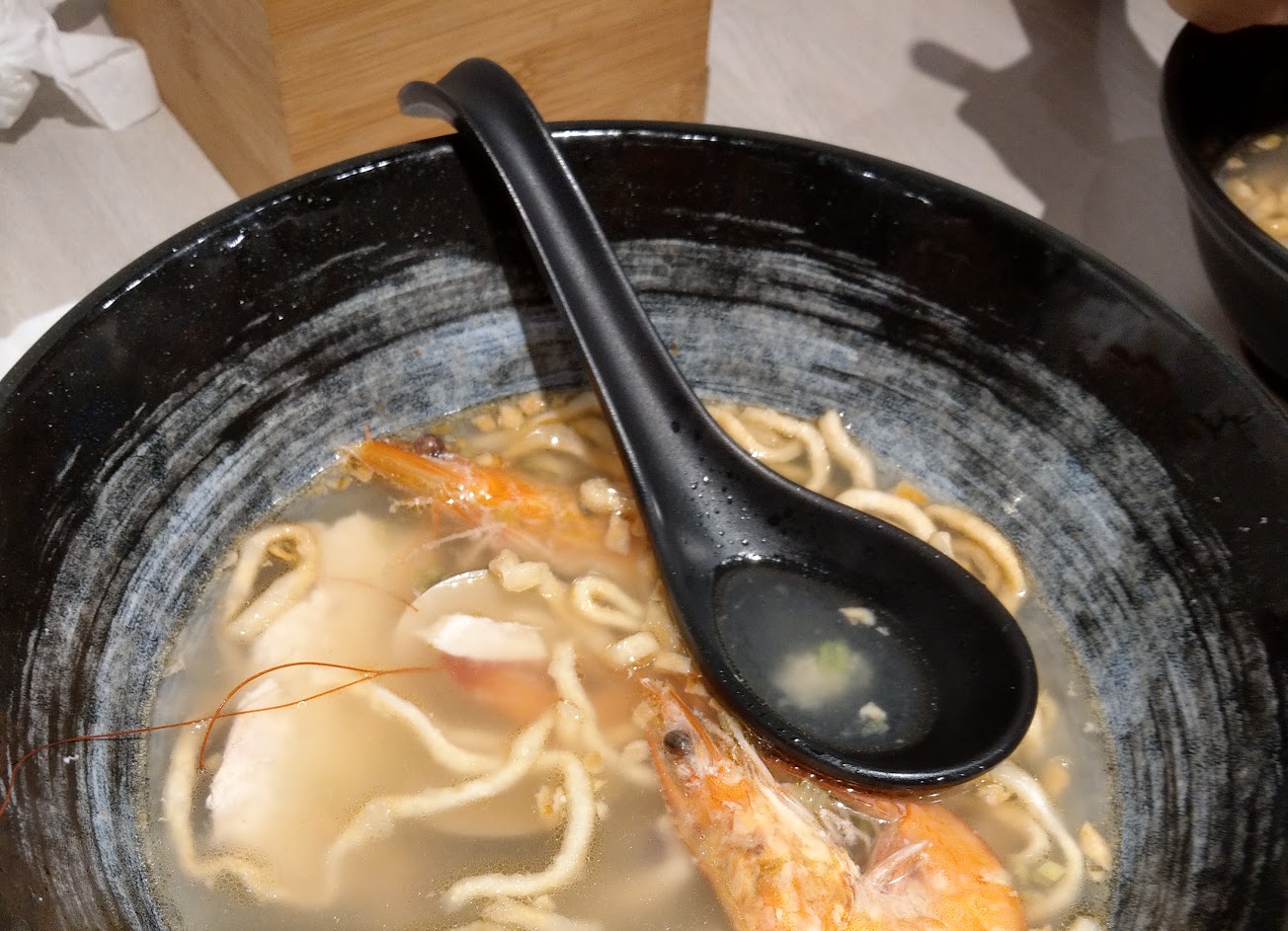海鮮意麵圖不符實 請記得檢查外帶碗內容物 湯中有油蔥 希望店家先告知 魚片老而不新鮮 使海鮮愛好者卻步 麵體充斥濃厚海腥味 需藉友人麻辣鍋浸泡去腥 蝦子新鮮度尚可