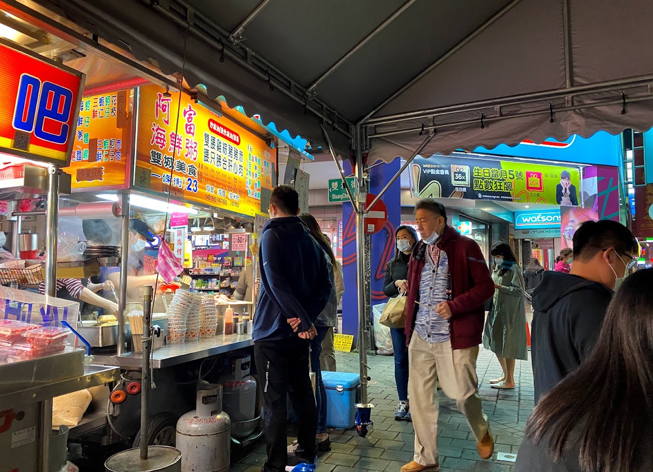 夜市的粥攤。海鮮粥有蝦子、魷魚、白魚、生蠔、魚片、豬肉? 、豬肝、高麗菜、蔥、芹菜等。粥不像粵式粥那樣糊狀,而更像粥。配料非常多,保證讓你滿意。