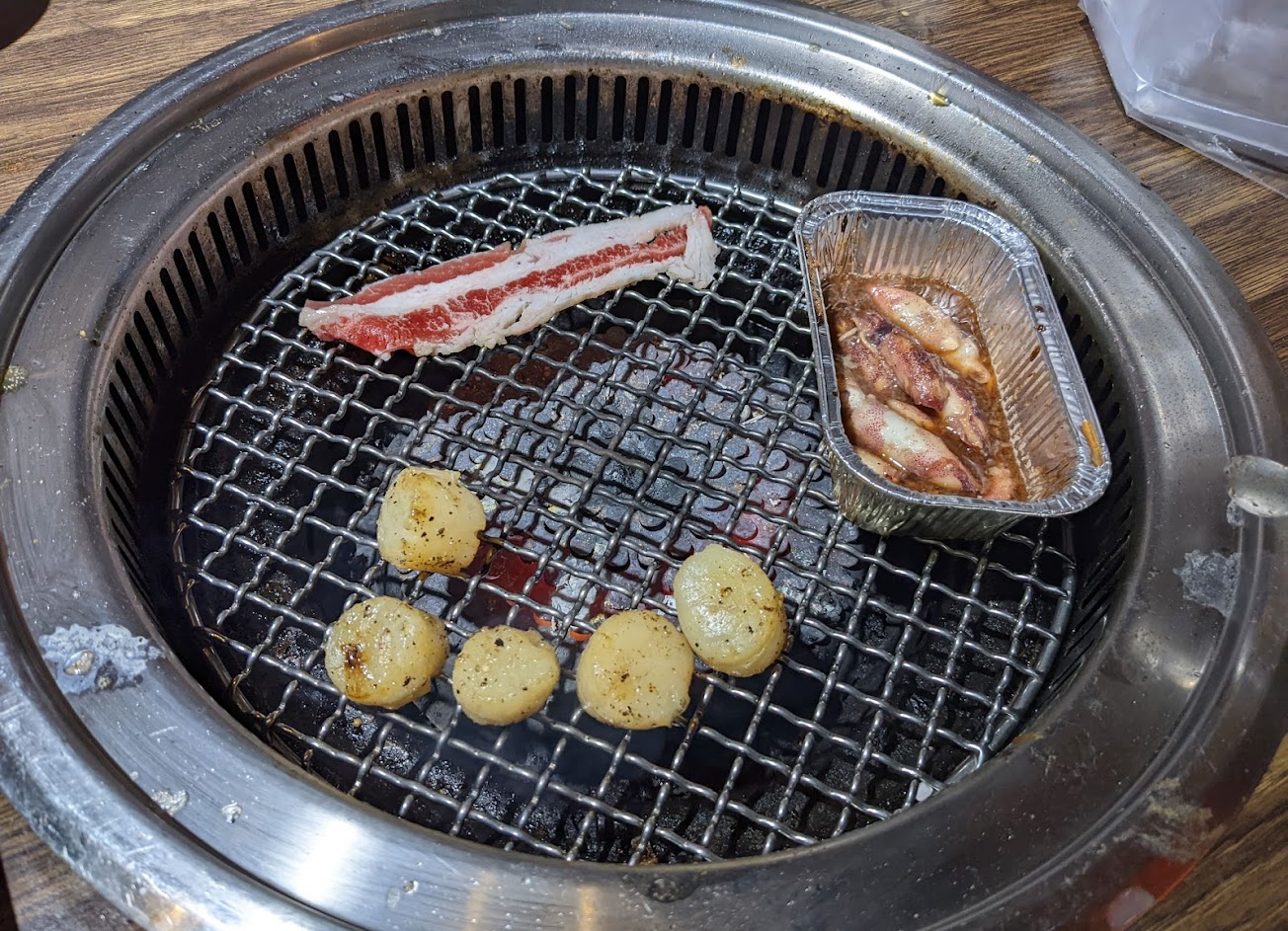 海鮮上有北海道大干貝,但不知道為何好像含很多水,烤起來跟一般外面的北海道大干貝感覺不太一樣,而且會邊烤邊縮水,口感好像也不太一樣,干貝的絲也會黏在網上被撕下來…好像有點怪怪的