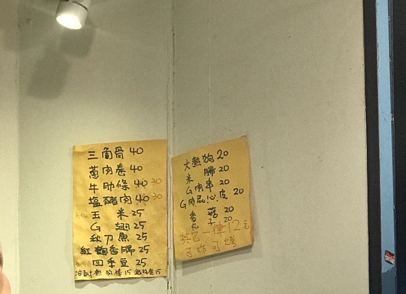 老闆娘親切熱情,見面第一句話就是提醒客人小心臺階。產品十分平價動人,除牛肉豬肉外一律十元,而前兩項串燒也才20元而已,另外雞排40元、烤玉米20元也是大家喜歡的品項。 店家採用先炸後烤的方式,燒烤的時候會塗上醬汁,可以跟老闆娘調整醬汁多寡,另外,辣粉蠻辣口的,嗜辣者別忘了加辣,尤其辣粉與醬汁牢牢沾附在食材表面,絕對是宵夜必備。 由於是現點現做,等待需要一點時間,門口有三張椅子可供休息,怕等待的人可以提早去,先去其他地方逛逛再回來。