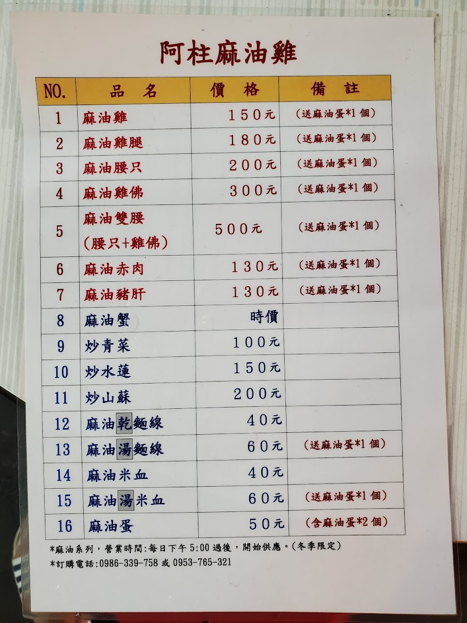 (2022年2月) 麻油系列沒有標價,但因為附近好幾家都有賣(包括店面的阿圖麻油雞),所以沒有詢價就點了麻油雞麵線。老闆動作算是俐落,煮完麵線還說等等我煎個蛋給你,出乎意料於是我客氣地回應謝謝。結帳才知道一份是220元。內容物有四塊肉(兩節翅,翅小腿,雞腿肉前段切兩塊)份量並不算大,麵線以一般來說是小份,而麻油煎蛋看了其他人的評論就知道是本來就包括在價錢裡,最後湯頭相對阿圖來說比較濃味但也比較油。整體來說不會覺得值得這個價錢,尤其是相對別人貴許多卻不標價的情況下,很容易讓人有下次絕對不會再買的覺悟。