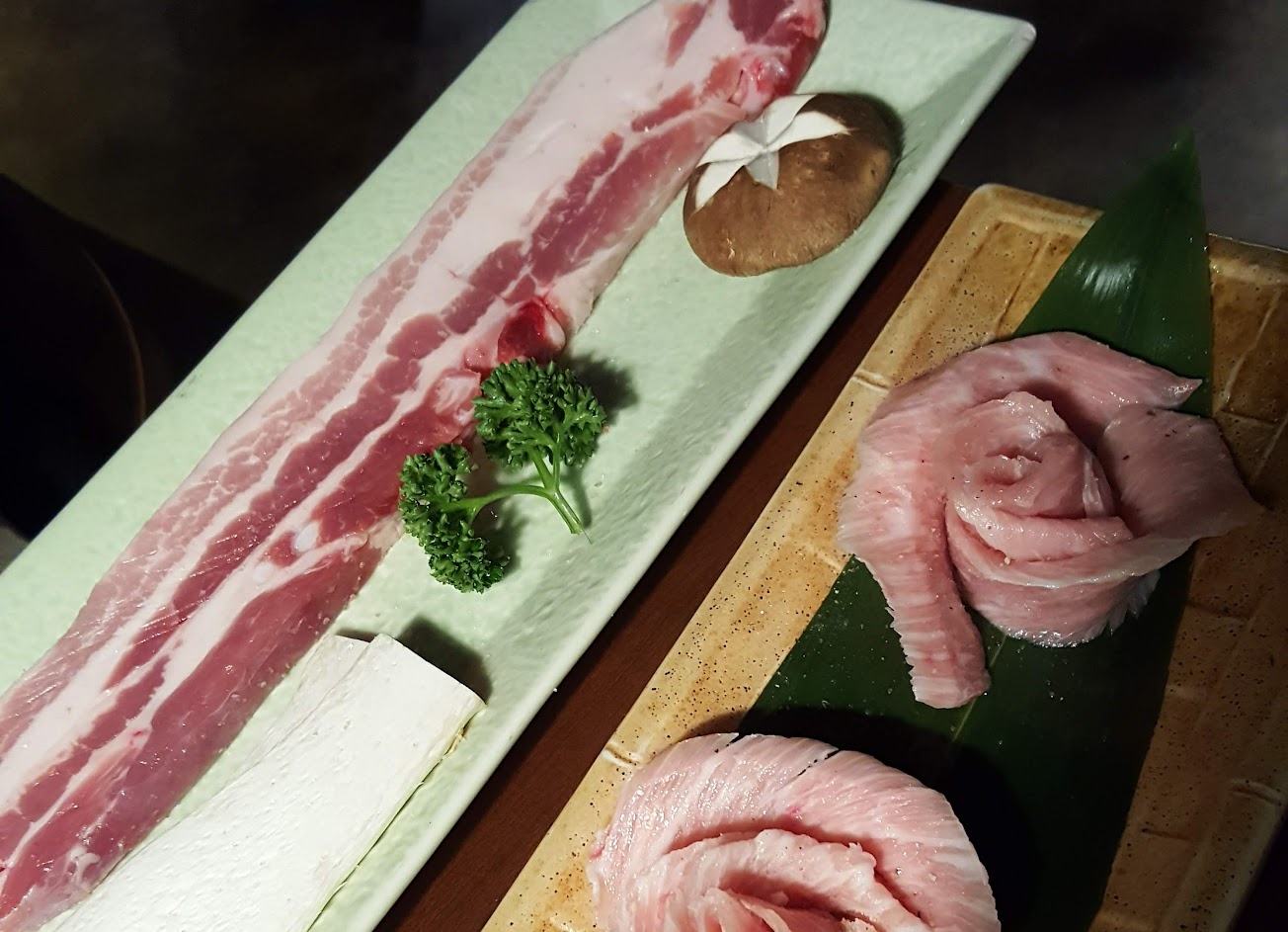 鐵盤烤肉點的是韓式辣醬五花肉,烤肉全程都是服務生幫我們烤,還蠻貼心的,會先上鐵盤、醬料(辣醬、鹽特調的醬)、肉及生菜,接下來服務生就會幫我們把肉都烤完(還蠻迅速的桌邊服務),五花肉是帶有一點肥肉的部分,怕肥肉的人可以點松阪豬或梅花肉,搭配醬料包著生菜吃還蠻有韓劇的感覺,以價位來說份量適中。