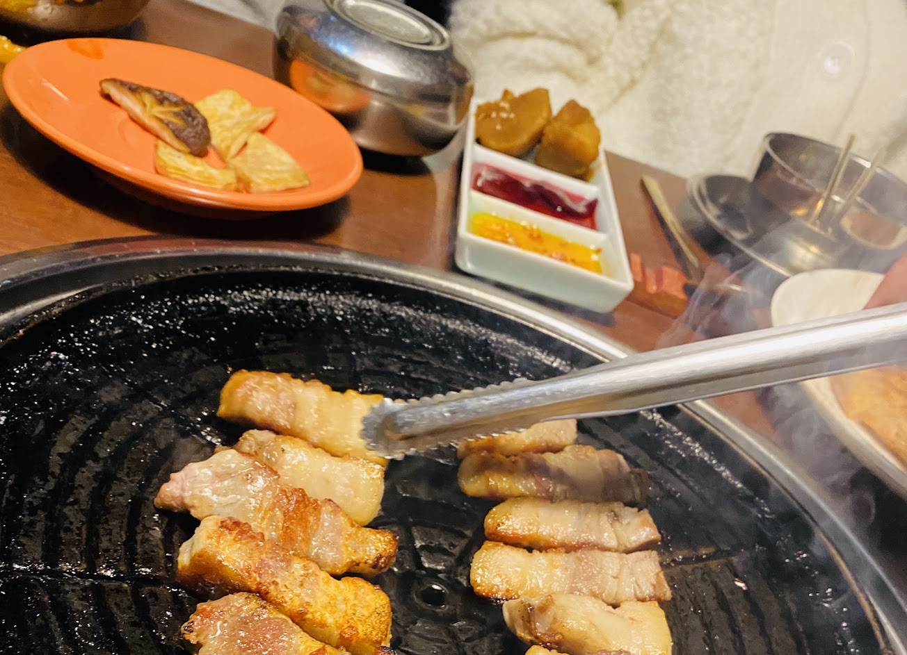 接著店員會過來幫忙烤肉,期間看店員也是烤得很不耐煩,不過烤完的五花厚片確實很酥脆,用生菜包豆芽、泡菜和豬五花是很道地的吃法。