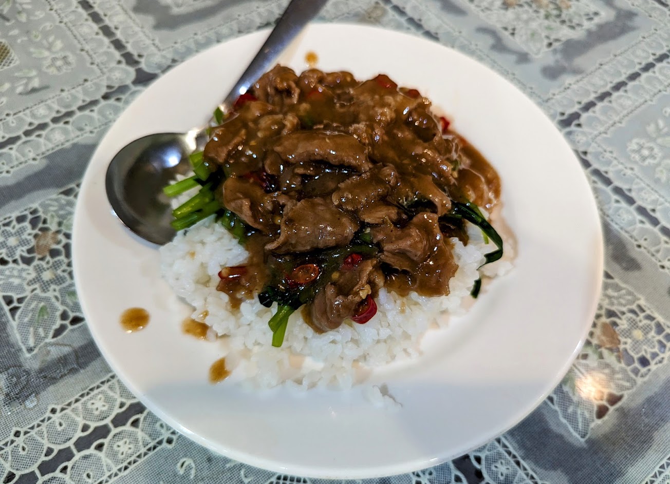 勾芡感恰到好處,香氣四溢搭配蒸到飽滿的米飯,快速拌炒的牛肉片。