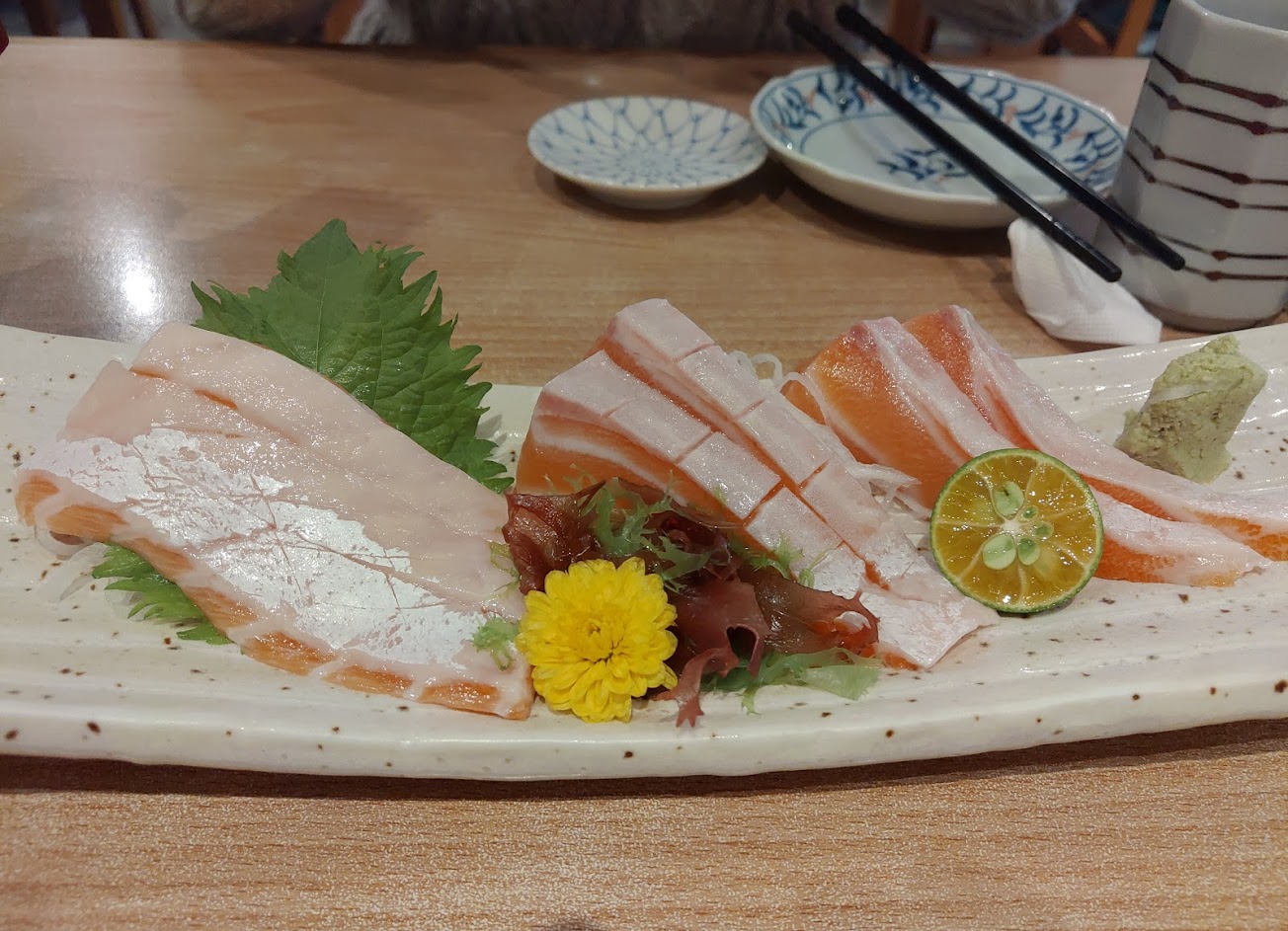 生魚片不錯 壽司完全不行 魚片很黏 哇沙米太多 蝦手卷普普