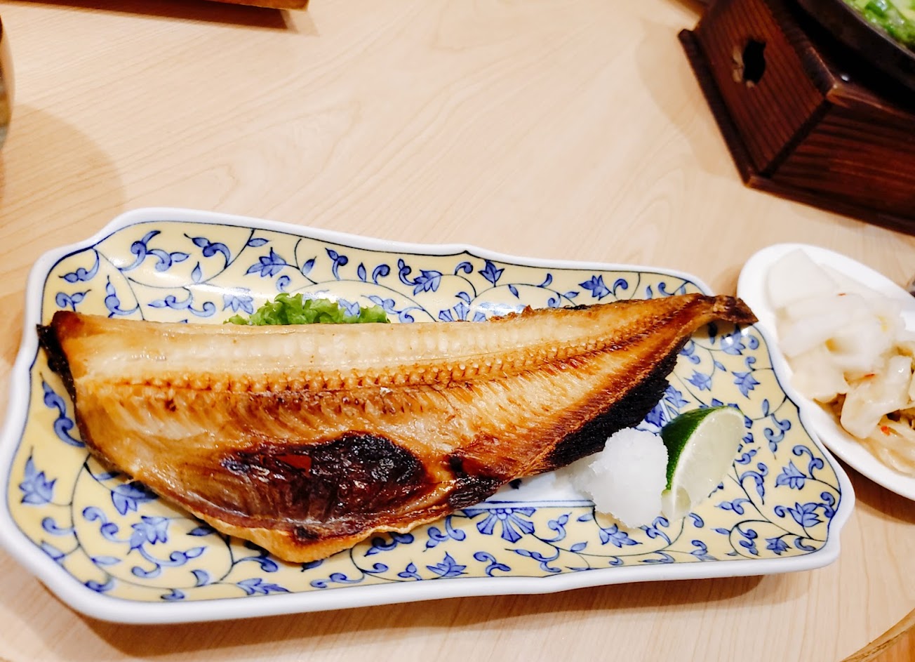 烤魚套餐230: 白飯(粒粒分明),燙菠菜,醃漬小菜,海帶味增湯(有點鹹),茶碗蒸(蛋很嫩),主菜是烤魚,肉質很飽滿鮮嫩不柴,很入味但有的鹹,刺不多,還有茶凍甜點,cp 值頗高