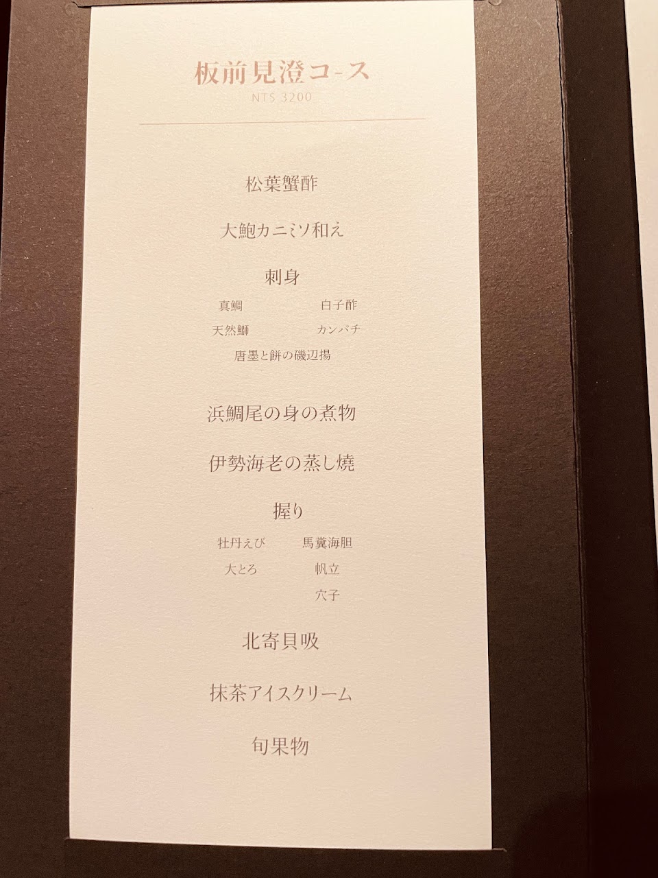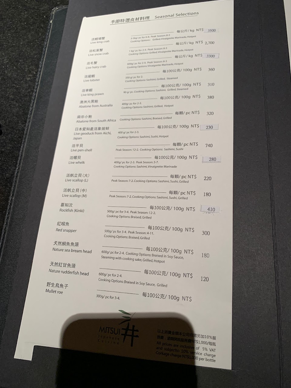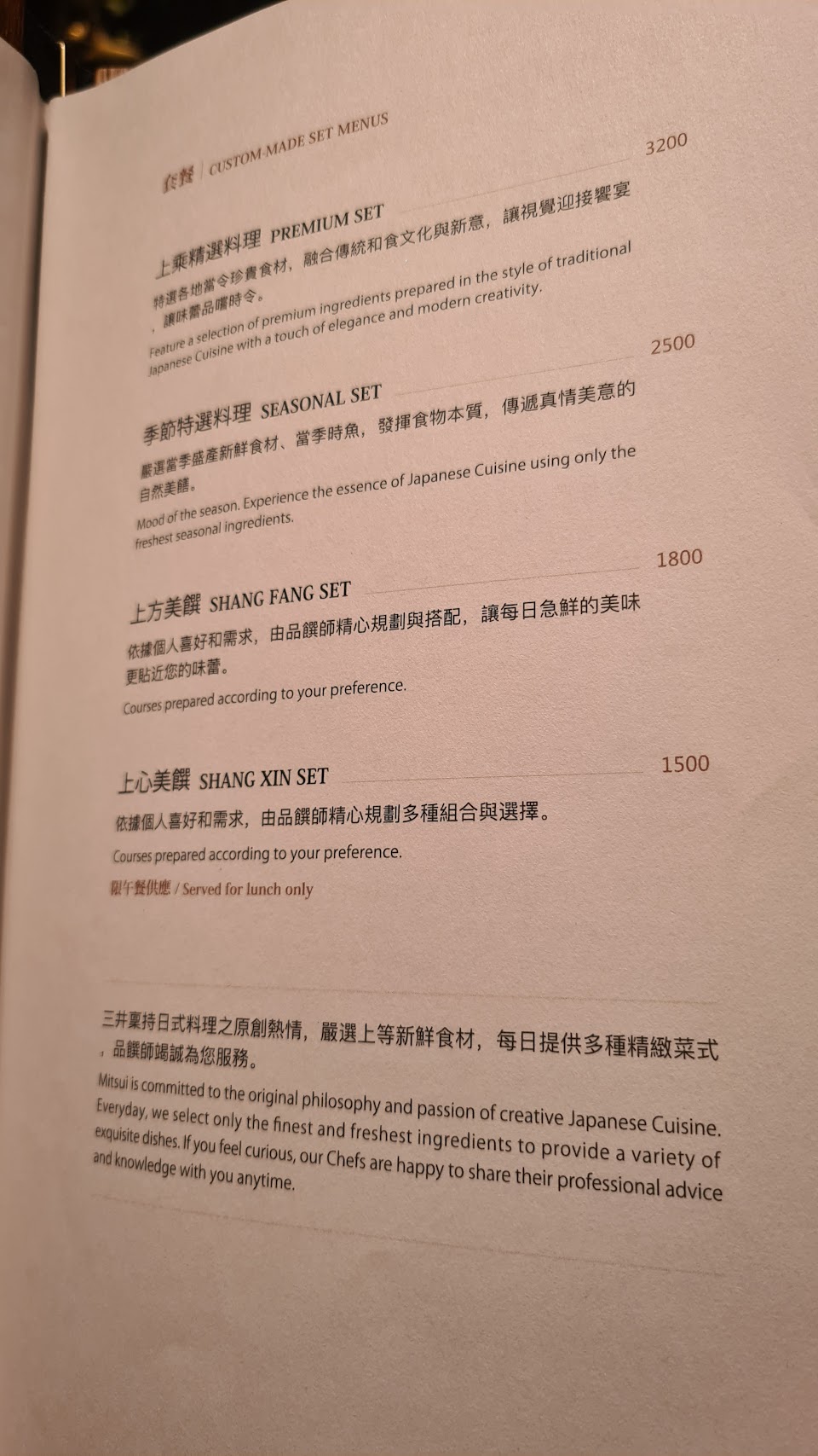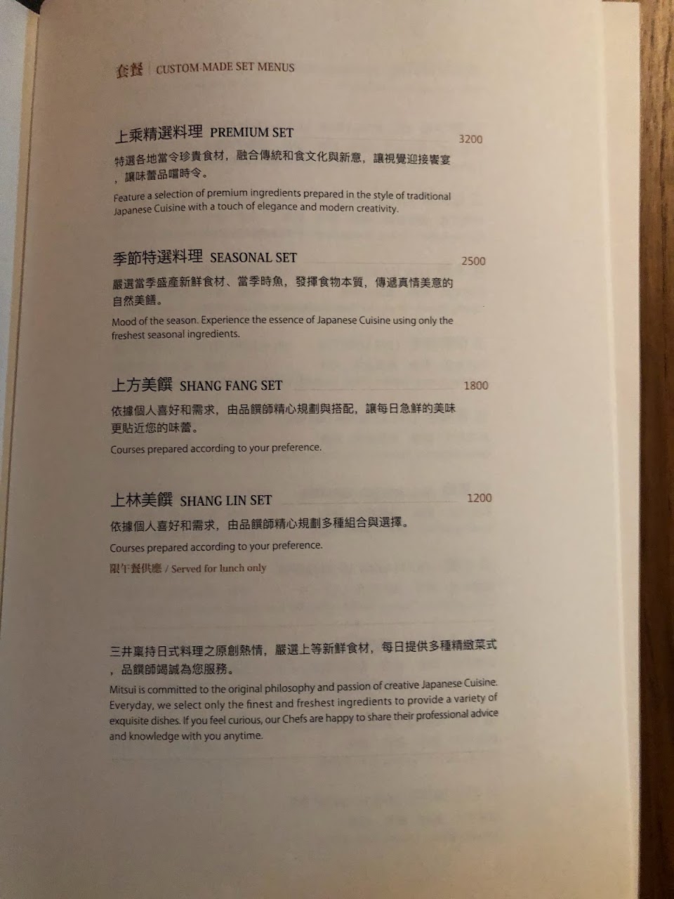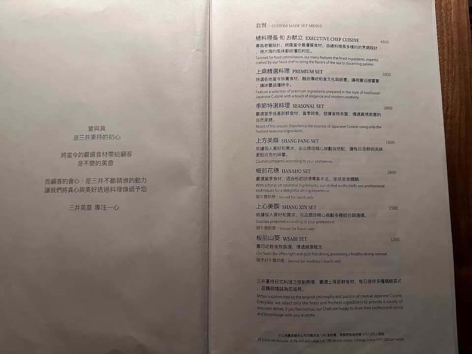 ?2500大洋享用的季節割烹料理雖然吃到最後還算有些飽腹感,不過真心覺得空虛寂寞有點冷,以這價位上層三井的魅力對我來說在於它對空間的精心設計,不過在這昂貴的背後美其名的有專業品饌帥之名,帶來的卻是不專業的無解說配菜的服務與服務弟弟膽戰心驚應對客人詢問的慌亂之色,或許是因為期待太高導致失望越深,在享用的同時卻感受到機械式的服務實是可惜,以這個價位在現今許多日式餐廳絕對會有更加鮮明且美味花俏的用心網美餐點呈現,或許對於套餐的呈現及品項上是不是該重新檢視規劃了呢?