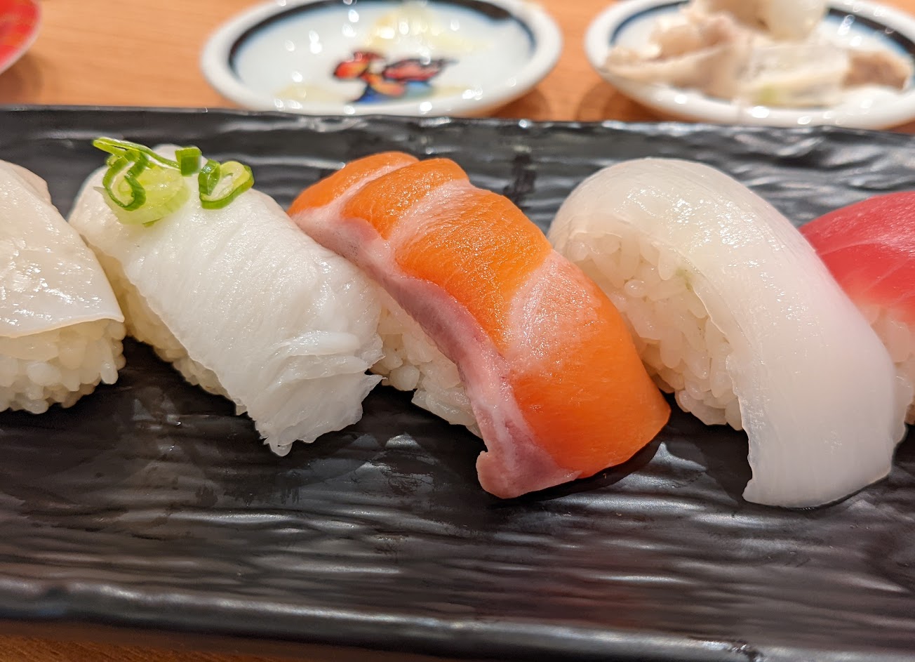 壽司五貫,鮭魚握壽司,鮪魚握壽司都很超值。