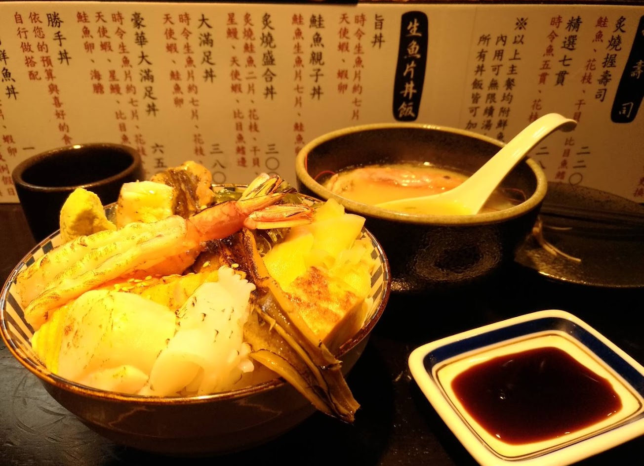 我們點的是一份鮭魚親子丼跟大滿足丼,老闆對於食材的堅持真的讓人感受得到,每樣食材都很新鮮,生魚片入口即化,份量也很足夠,點主食都會附贈一碗湯,湯裡有魚肉、蘿蔔、蛤蜊,主食有蝦的話,湯裡會有蝦頭,強烈建議主食點有蝦的,雖然沒有蝦頭的湯也很好喝,但那個蝦頭感覺讓這碗湯又上了一個檔次,每碗湯都是現煮,非常用心,價格以台北來說很平價。不過因為店面很小,一定要早點去候位,真的要說唯一缺點是要等很久,不過吃完會覺得等待是值得的:)