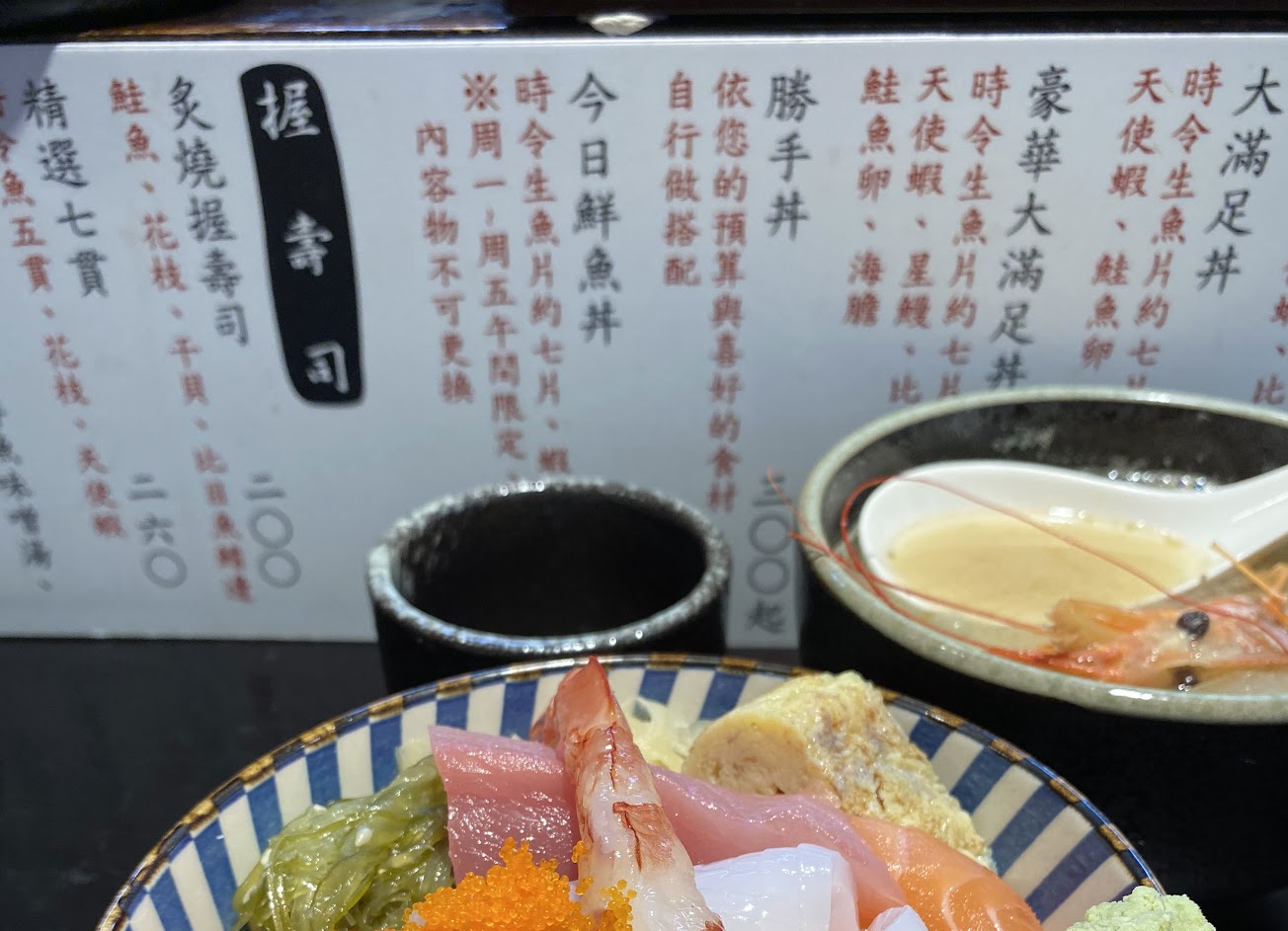 不錯吃 生魚片還蠻新鮮的 因為位置少所以通常都要在外面排隊 今天吃的是旨丼 一碗230元 有送一碗 海鮮味噌湯 有料的喔 吃了很滿足 湯還可以免費再續 但是沒有那個肚子在 喝 湯很好喝 下次要來挑戰 大滿足 360元 或者是680元的豪華大滿足