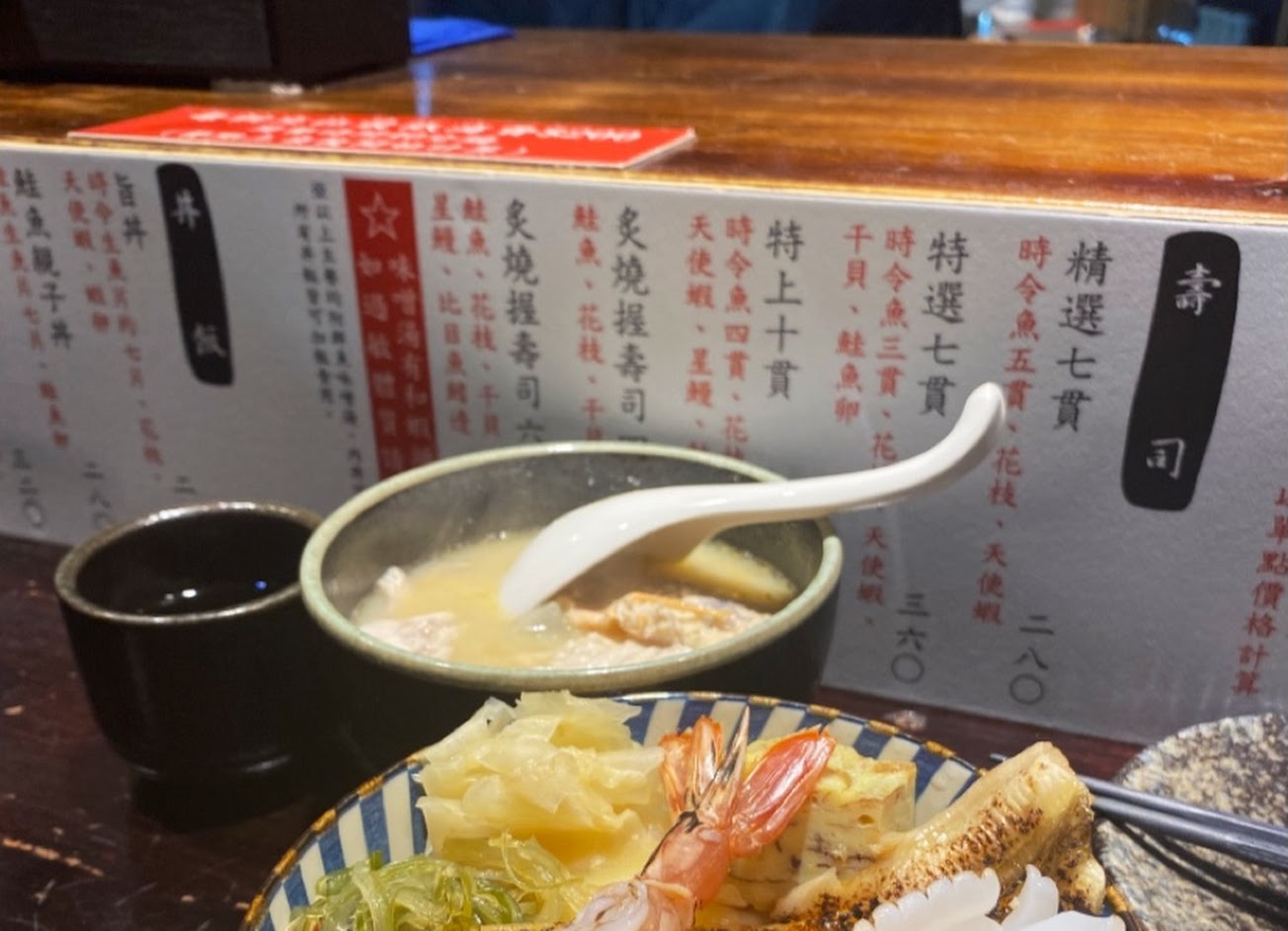 CP值蠻高的,價格不貴,食材新鮮,味增湯超豐富超好喝,唯一的缺點是他只有9個位子,不能訂位,所以好幾次我5點去排隊都要7點才能吃到