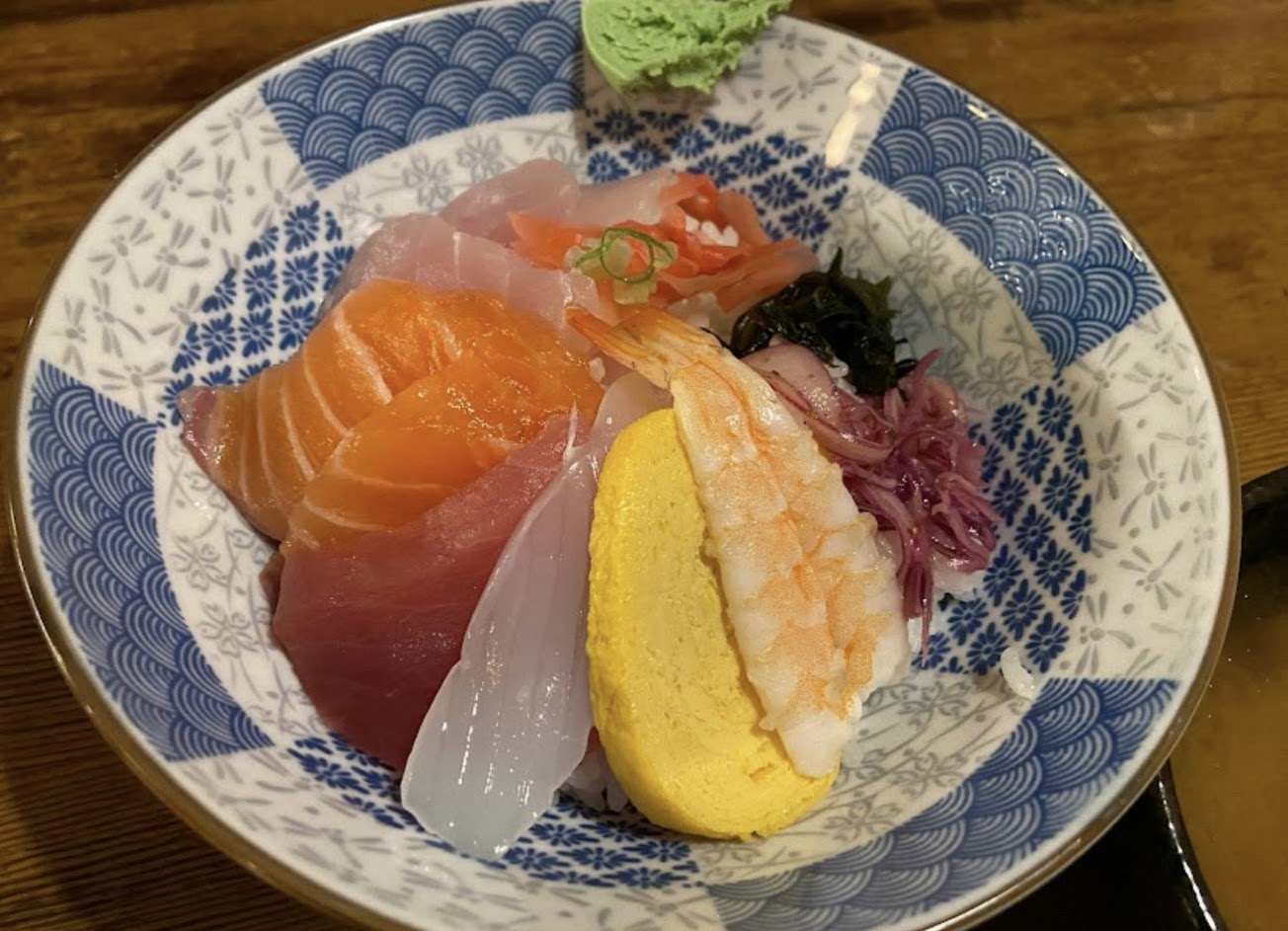 個人首推生魚片丼飯,可以吃到多種不同的魚肉,醋飯的口感也很好。不喜歡冷飯的朋友,也可以選擇熱飯。味噌湯也非常美味,口味有稍微在地化過,不會過於死鹹。可以續飯一次,不用怕吃不飽。