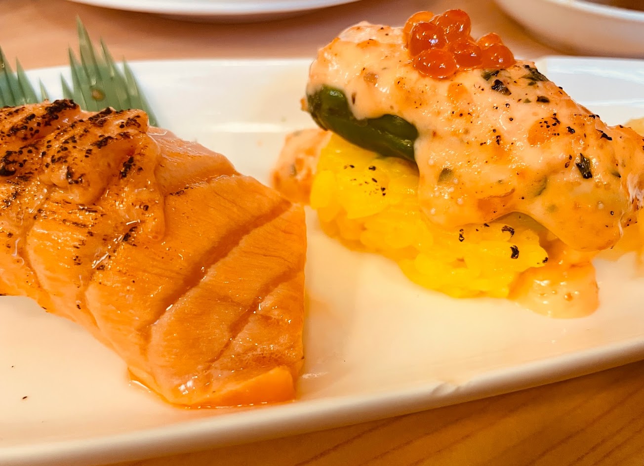 炙燒鮭魚丼*2、炙燒綜合7貫壽司,2人;