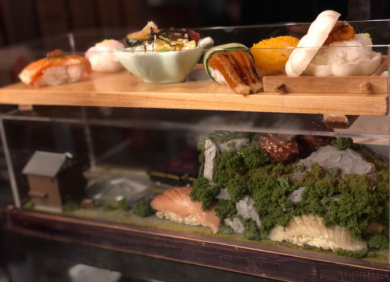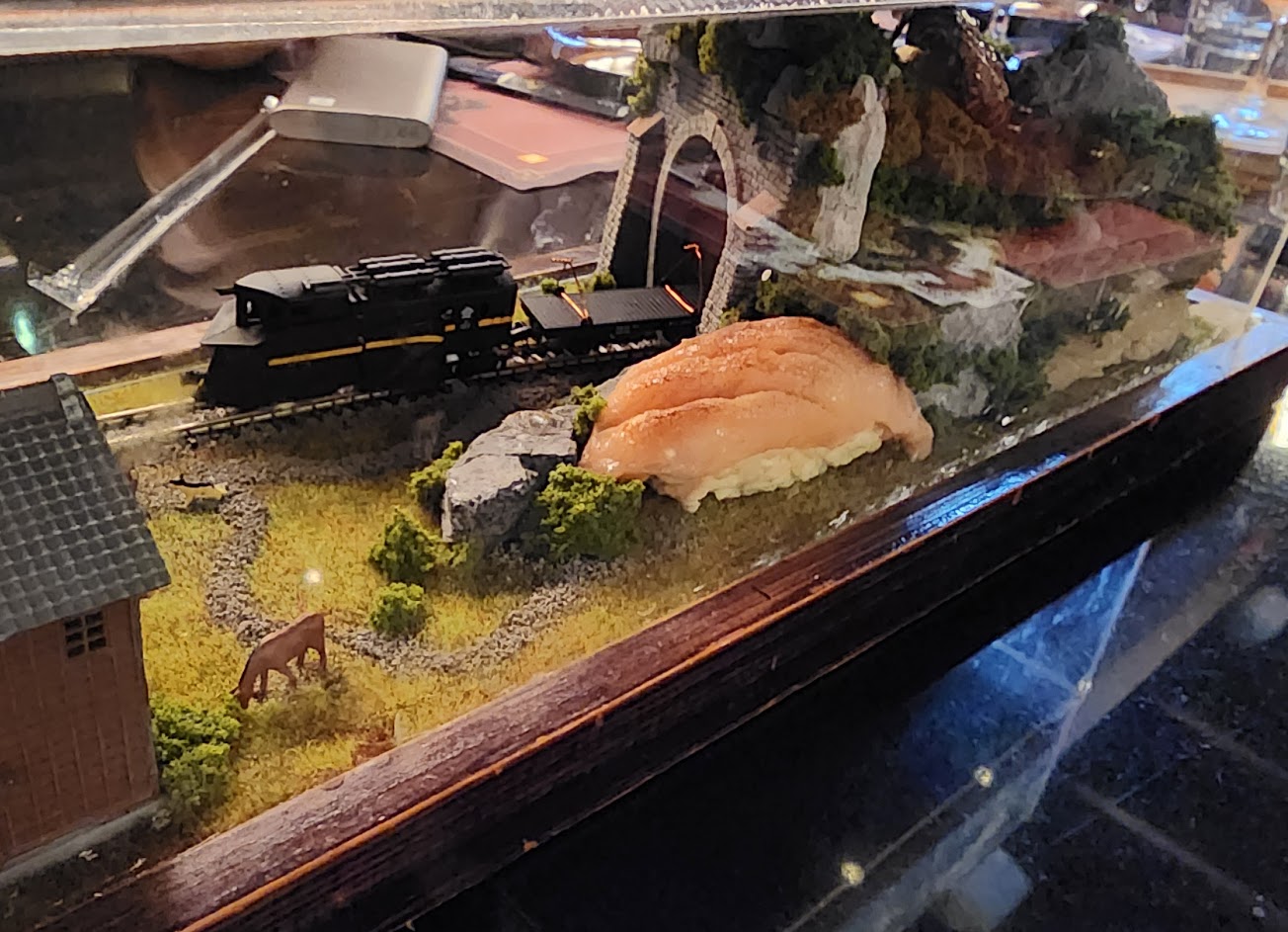 來大車輪絕對必點,也因大車輪是火車的迴轉壽司的始祖,延續了最經典的火車壽司,每一種盒火車壽司系列,用特殊規格的訂製的盒子,裝了餐點,下面都有不同的情境風格,以模型的方式來敘說大車輪的故事。