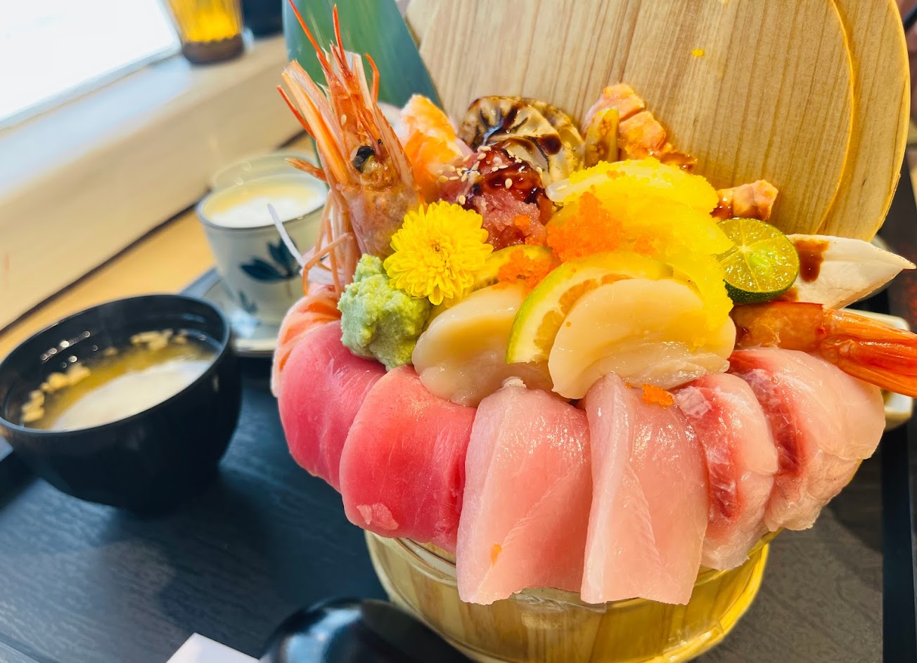 選擇「網美打卡丼」(470元)作為初體驗的料理。木桶造型的擺盤,上桌時有驚豔到。主角為各式生魚片、干貝、蝦、蝦卵,新鮮好吃。醋飯軟硬適中,令人歡喜的口感。
