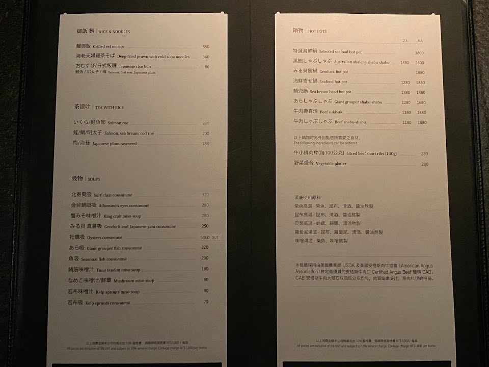 生魚片新鮮,炸物好吃。最喜歡的還是烤魚,喜知次烤起來非常好吃。當然價位稍高一些。特選握壽司可以請廚師幫忙炙燒。蒲葉燒牛肉擺盤有趣,國外客人吃起來很喜歡,雖然肉質普普。中午的套餐現在滿貴的,要1500起跳。而且最後連本來免費的甜點都取消了。令人有些失望。女生吃其實單點一個人一千多的餐標就可以吃很飽了
