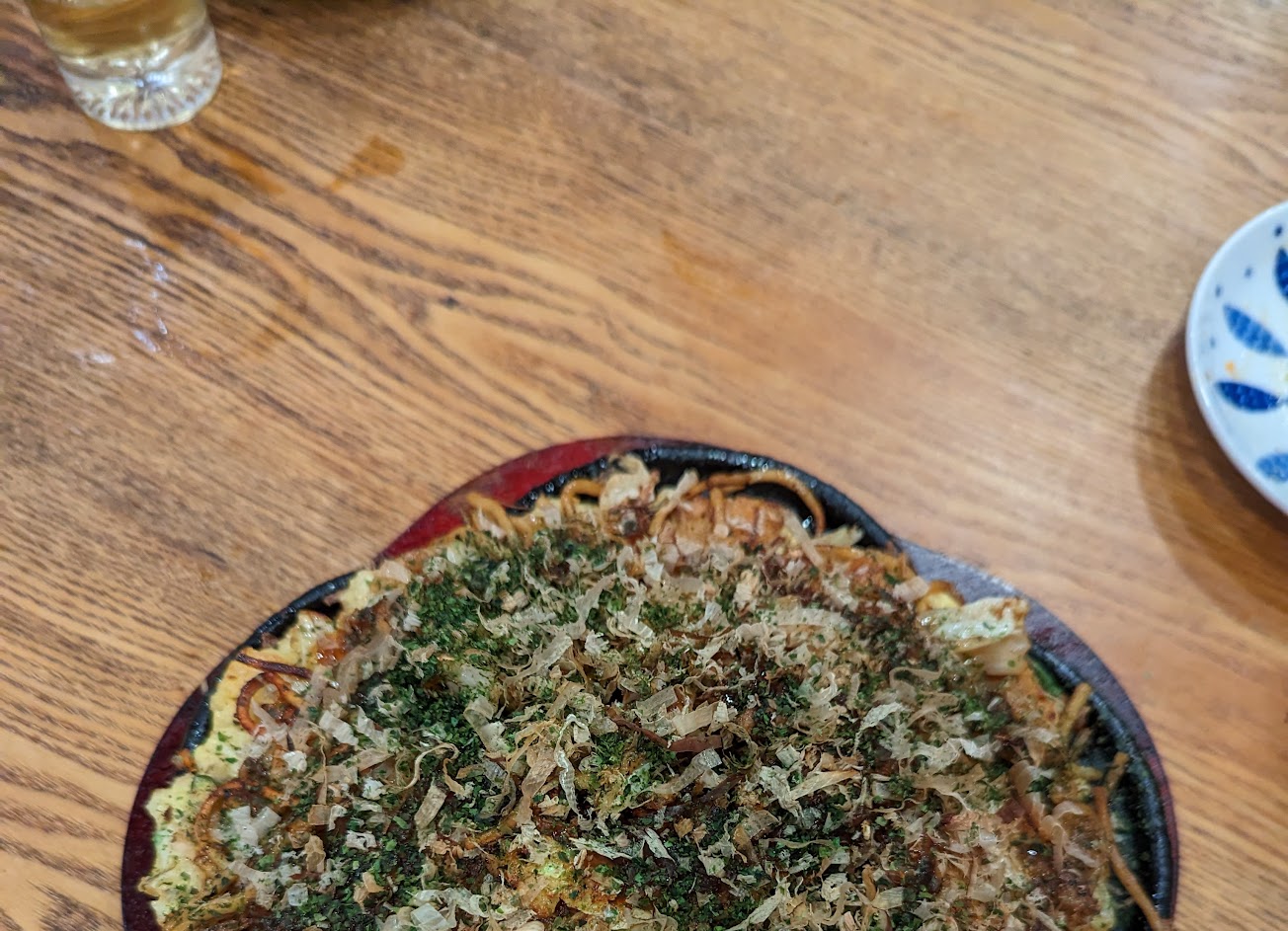 雞腿塊鮮嫩多汁,但有點鹹,適合配酒;大阪燒就是大阪燒,厚切份量很大,適合兩人共食一份不然你會撐死