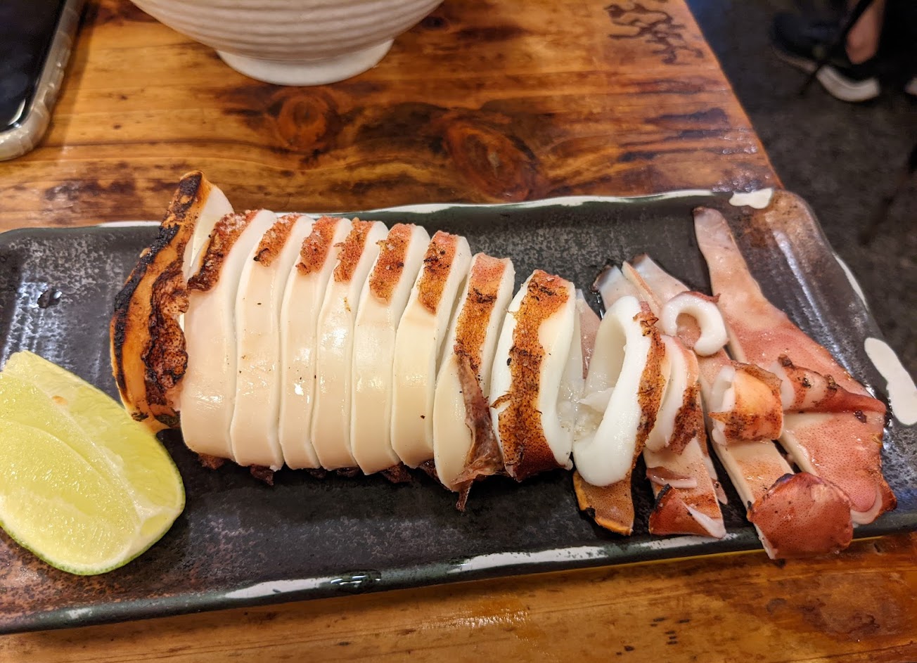 鹽烤透抽,吃不太出來鹽巴跟檸檬的味道,搭配桌上放的七味粉還好一點~但至少透抽烤得熟度還行~