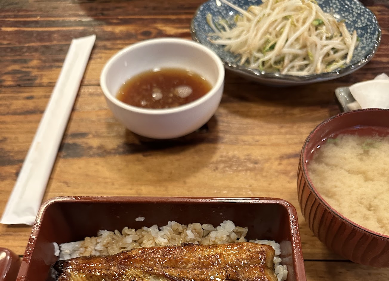 鰻魚飯的魚肉軟綿,但我認為稍乾,反而底下浸著醬汁的白飯,是整體的亮點。每份主餐都會附一碗味噌湯,日式餐廳的標配。