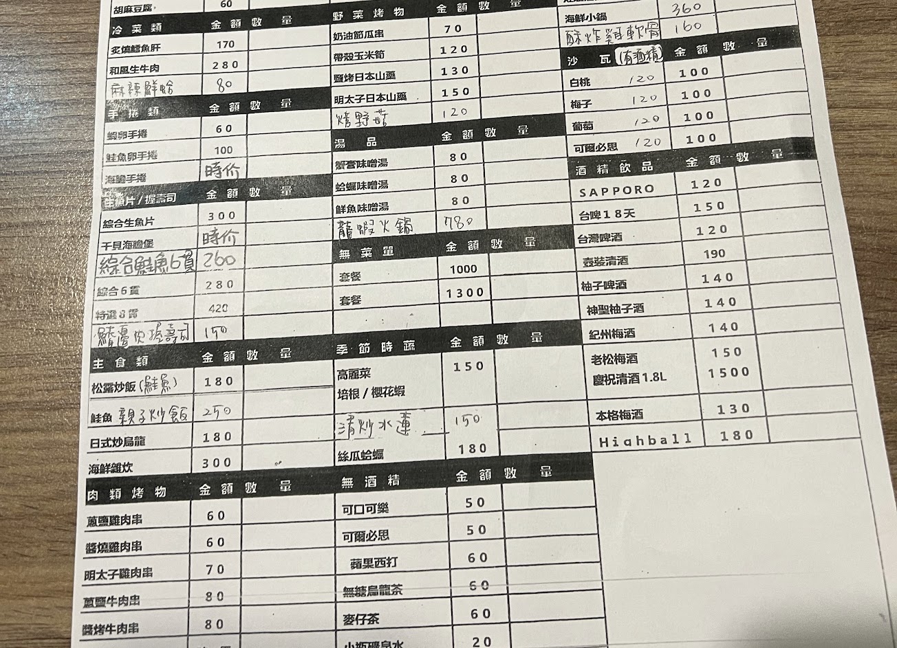不建議點無菜單,真的不記得吃了什麼有記憶點好吃食物,四個人點1500/人,生魚片每人五片、烤魚新鮮很小條卻要四個人分(一人一口的意思)、一人一隻鹽焗蝦沒調味且不鮮甜、牛排極度老調味是百元熱炒等級、干貝海膽普通、比目魚握壽司普通。還有老闆說附近有市場,蟑螂比較多,一個月消毒兩次的情形下,蟑螂還是從沙母鍋的瓦斯爐跑出來。服務態度也是不太好,完全搞不清楚客人付了多少訂金、訂了什麼餐點,沒有復述確認點餐內容,1500/人的無菜單也是第一次吃到把料理丟上桌什麼都沒解釋,店員說話的方式就是把話說出來、對方還沒理解就不見人影的狀態,過程中發生了很多不必要的誤會;吃完沙母鍋店員就要大家把料盛出來,並表示我們不盛出來他們也會盛出來丟掉,卻不是用換小碗的方式處理。海鮮是新鮮但真的太貴了,一樣的錢去吃初魚可以清清楚楚且精緻,不用受氣。向老闆反應過不舒服的用餐體驗後,老闆提出飲料那張單的錢不用算了,但在我轉身之後縮小範圍到無酒精飲料,真的是很會做生意。看到這篇評論的各位,真的可以有更好的選擇。
