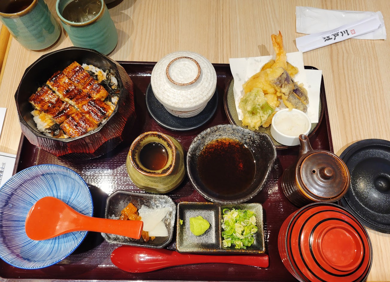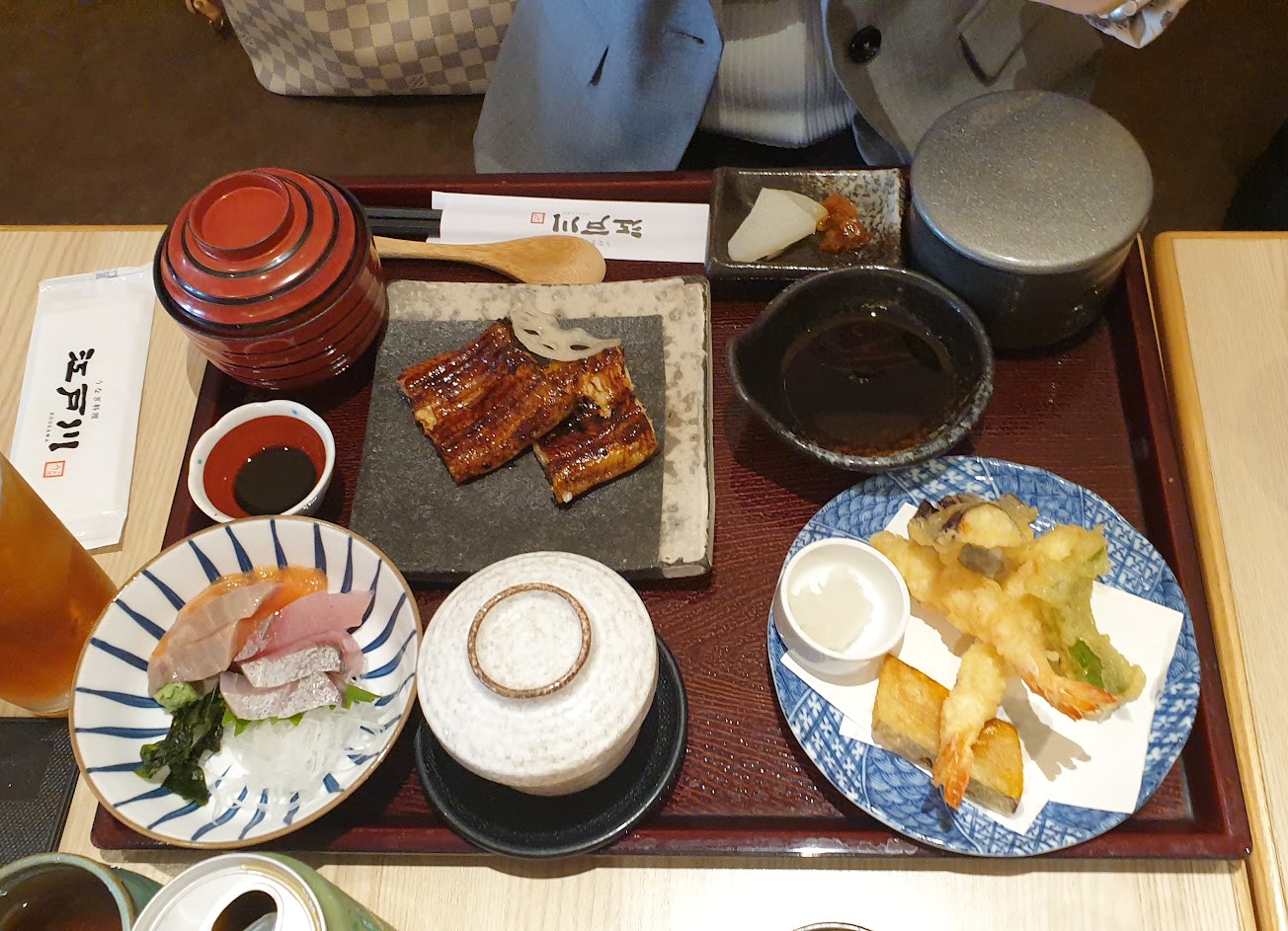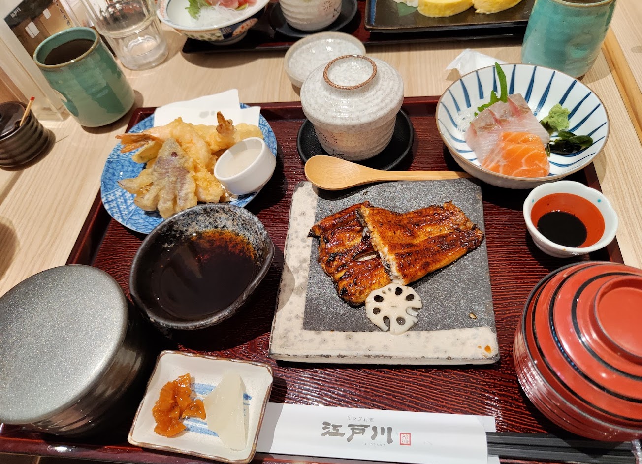 江戶川套餐除了可以吃到店裡招牌的鰻魚之外,還有炸蝦天婦羅、生魚片、茶碗蒸、醃漬小菜、湯,口味豐富且美味,連白飯都很好吃,真的是非常滿足的一餐!?