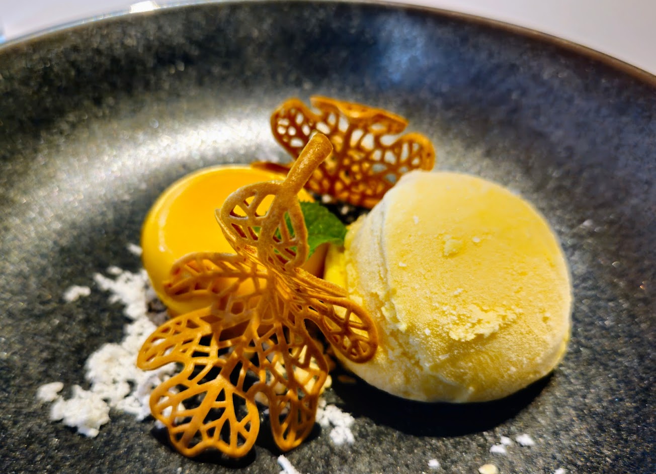 甜點-芒果慕斯佐水果冰淇淋,綿密慕斯與清脆餅乾一同咬下,口感豐富不會過於甜膩?