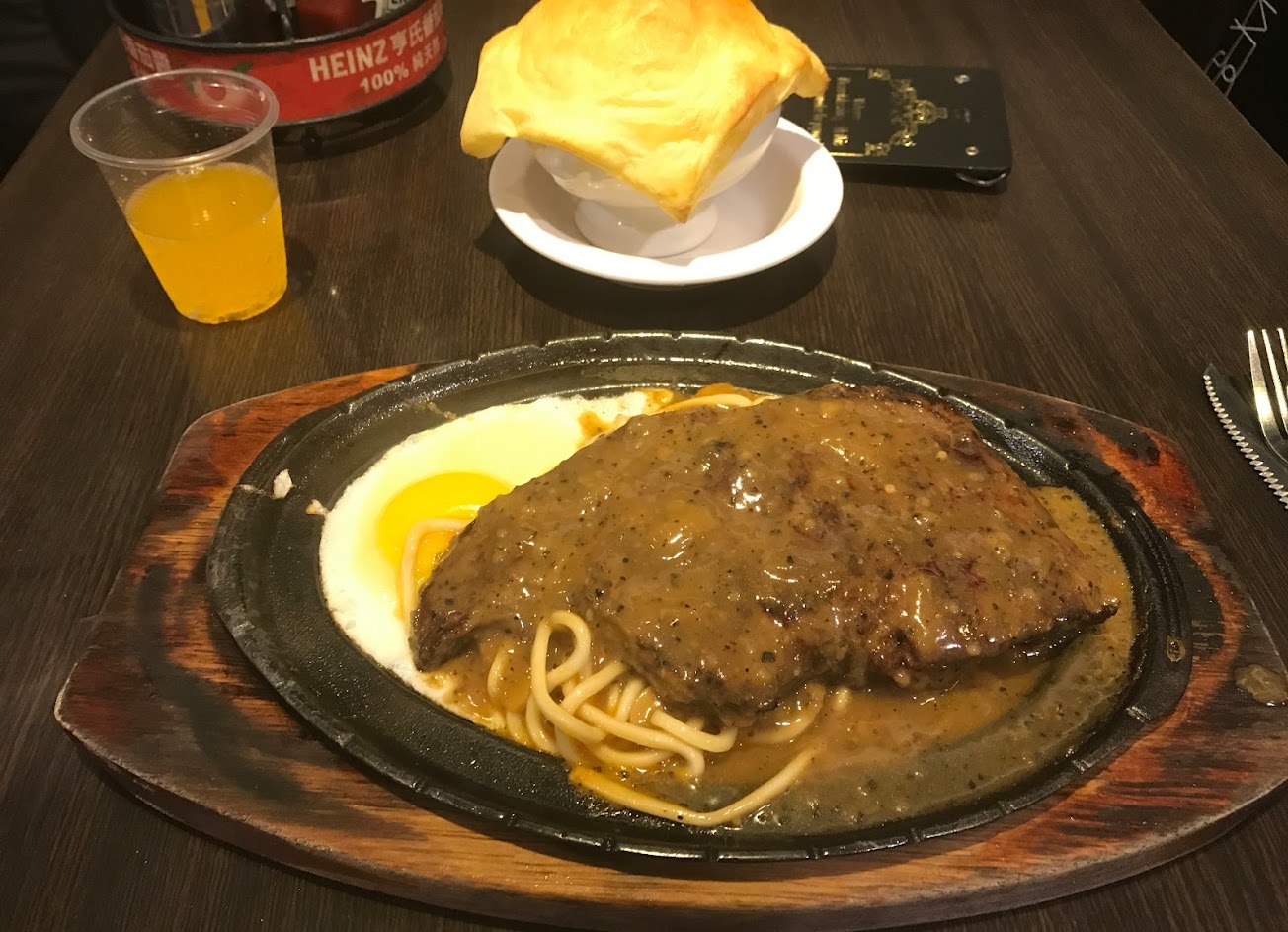 我們總共點了牛 豬 雞排。牛跟豬很不嫩、乾乾的,雖然一份有兩塊但是很薄,我室友的雞排雖然不會乾但是有一點燒焦味。然後麵超級不優,醬加的不夠多所以吃起來很沒味道。好處是牛排都有附酥皮濃湯跟飲料,如果花了只有一般的玉米濃湯跟紅茶,我會只給一分。圖是無法吃的麵