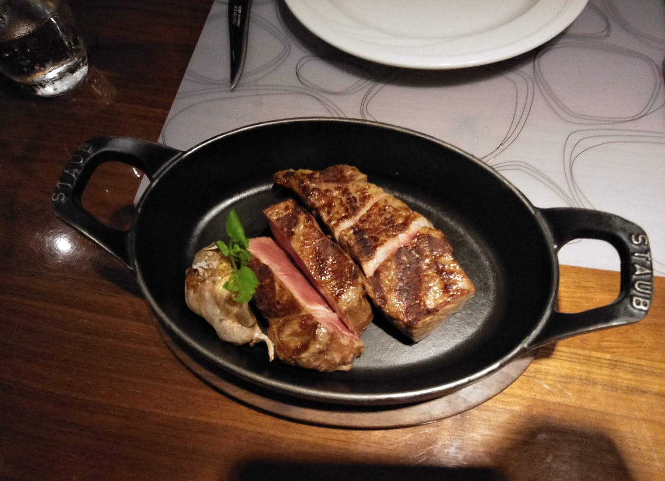 米其林一星的殊榮讓人很期待,裝潢氣派,服務親切(看得出來很忙但還是盡力給予優質的服務)乾式熟成牛排賣相很好但沒有很驚艷,和牛紐約客香嫩多汁,比較推薦。