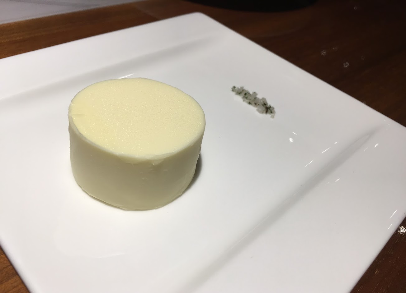好了,算了,點完餐,看到奶油都擺上來了,呵呵,我最愛的麵包要來了。想到要吃麵包先去上廁所跟洗個手,廁所裝潢很讓我失望,因為廁所裝潢是最容易看出有沒有用心的感覺,然後教父牛排很….普通,有只提供擦手紙沒有毛巾,質感low了點,大約花了3-4分鐘吧,一回座位,嗯,前菜已經擺在桌上了,也沒有任何服務生在旁邊介紹,這間『一星級餐廳』態度真是冷漠呀….