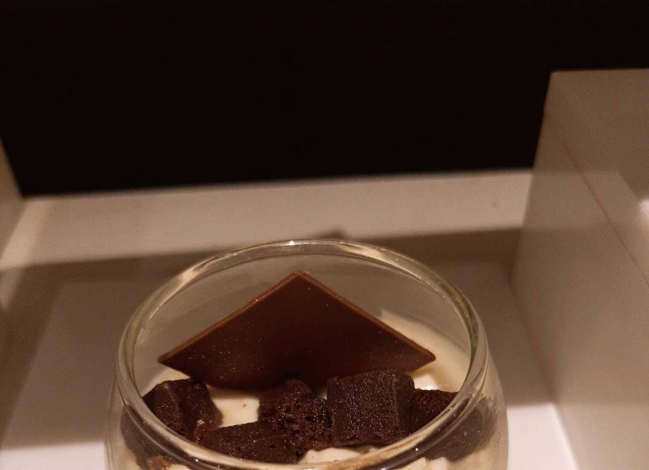 最後還吃了一個扁扁的巧克力蛋糕(裡面有餅乾脆脆的口感)上面擠了榛果巧克力醬及白巧克力醬,我個人非常喜歡!