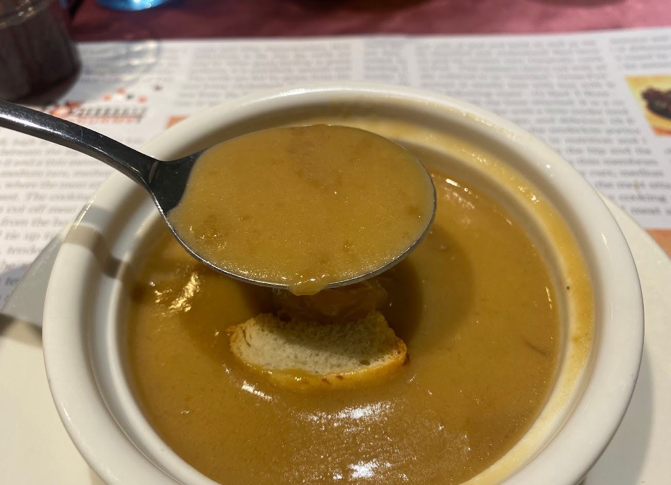 法式洋蔥湯:應該叫做「洋蔥濃湯」麵粉糊加的很多,洋蔥煮爛溶在湯中了,但味道被麵粉搶去。